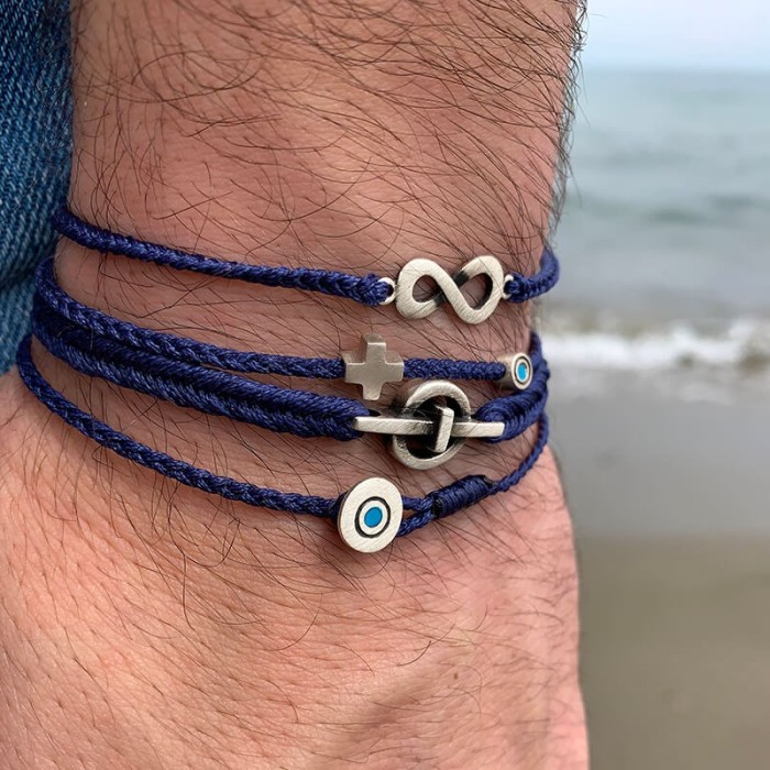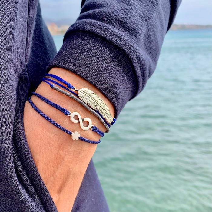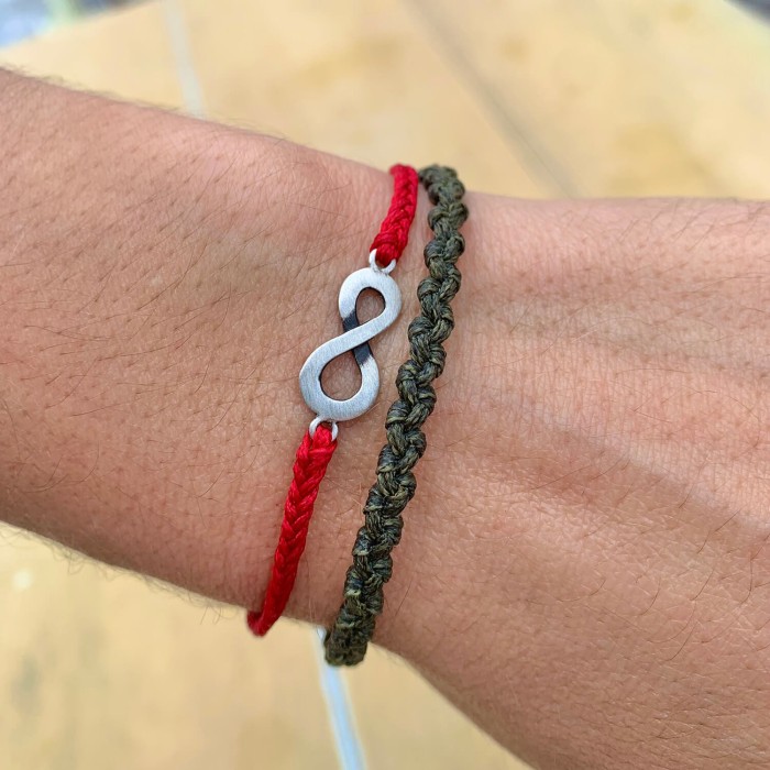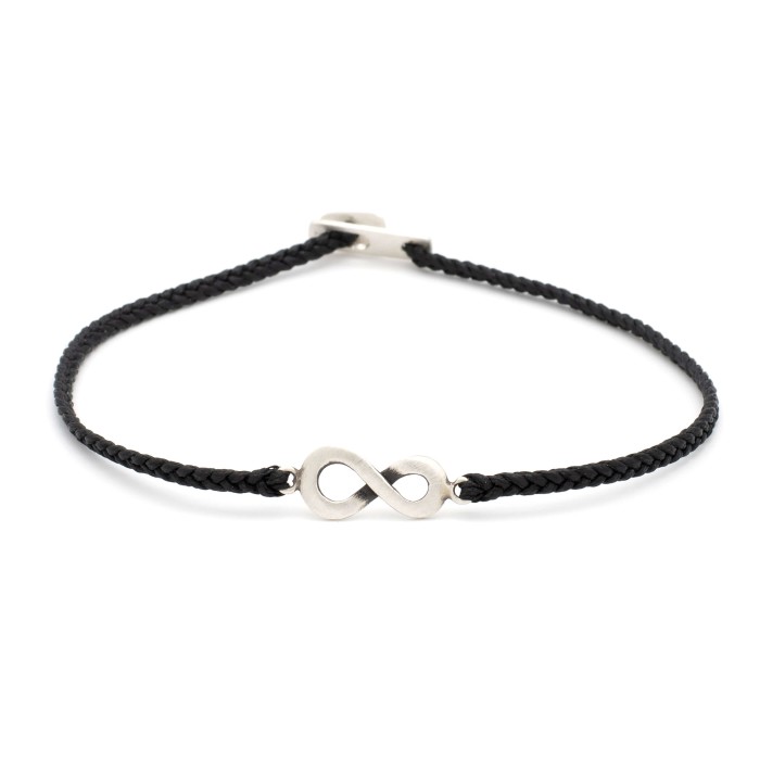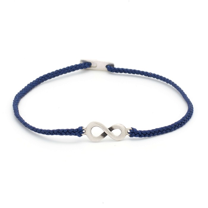 Ένα πλεκτό χειροποίητο βραχιόλι από πλεγμένη κηροκλωστή που προσαρμόζεται στο μέγεθος που επιθυμείτε. Το διακοσμητικό μοτίφ που απεικονίζει το 'Άπειρο" όπως και το κούμπωμα είναι από ασήμι 925.