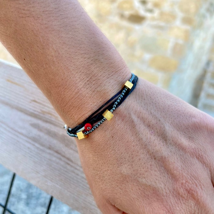 Ένα χειροποίητο βραχιόλι από κηροκλωστές και ημιπολύτιμες πέτρες, που προσαρμόζεται στο μέγεθος που επιθυμείτε. Οι 3 κύβοι, το στοιχείο όπως και το κούμπωμα είναι από επιχρυσωμένο ασήμι 925. Ένα κόσμημα μοναδικής αισθητικής που προσφέρει ένα στυλ μοναδικό και διαφορετικό.