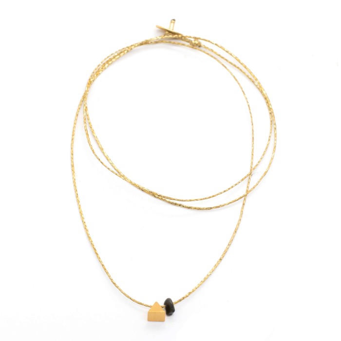 Ένα χειροποίητο κολιέ κατασκευασμένη από κηροκλωστή και επιχρυσωμένο ασήμι 925. Το ασημένιο πολυγωνικό στοιχείο που διακοσμεί το κολιέ είναι το κύριο χαρακτηριστικό του και η ημιπολύτιμη πέτρα είναι τυρκουάζ. Το κούμπωμα είναι κατασκευασμένο επίσης από επιχρυσωμένο ασήμι 925 και το κολιέ είναι αυξομειούμενου μεγέθους (μέγιστο ~60εκ).