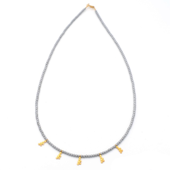 Ένα χειροποίητο κολιέ κατασκευασμένο με επιχρυσωμένα στοιχεία και ημιπολύτιμους λίθους.