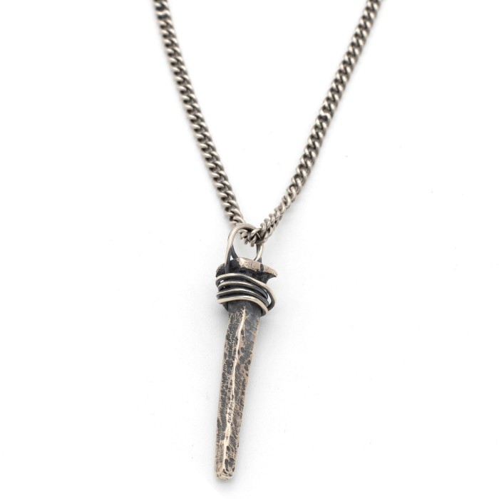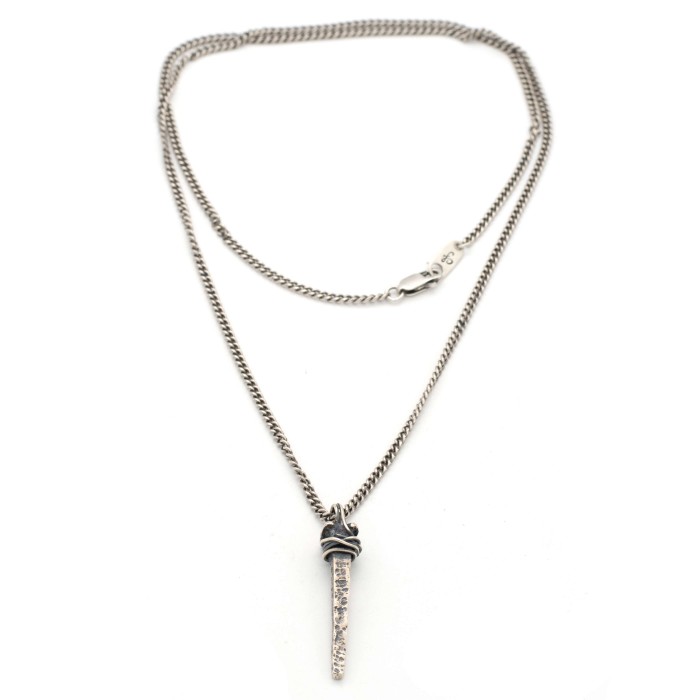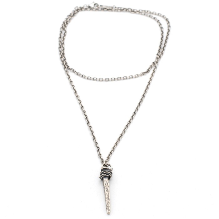 Ενα χειροποίητο κολιέ με ασημένια αλυσίδα μήκους 70cm. Το καλοσχεδιασμένο καρφί (~3,5 cm) και το κούμπωμα είναι κατασκευασμένα από ασήμι 925. Η μοναδική τους αισθητική και ο εξαιρετικός τους σχεδιασμός δημιουργούν μια εικόνα διαφορετικότητας και ιδιαίτερου γούστου.