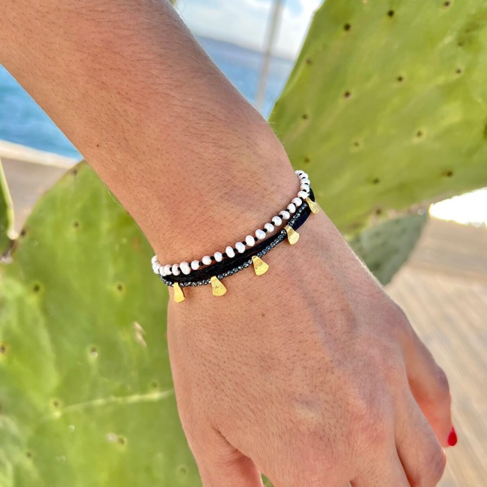 'Ενα χειροποίητο βραχιόλι με κηροκλωστές, ημιπολύτιμες πέτρες & επιχρυσωμένο ασήμι 925. Το μέγεθος του βραχιολιού είναι ρυθμιζόμενο.