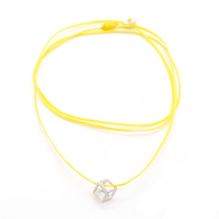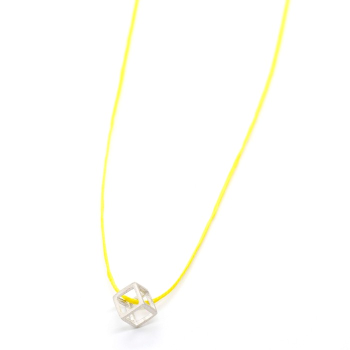 Ένα χειροποίητο κολιέ κατασκευασμένη από κηροκλωστή και ασήμι 925. Το ασημένιο στοιχείο που διακοσμεί το κολιέ έιναι το περίγραμμα ενός 3D κύβου (0,5*0,5*0,5 εκ). Το κούμπωμα είναι κατασκευασμένο επίσης από ασήμι 925 και το κολιέ είναι αυξομειούμενου μεγέθους (μέγιστο ~60εκ).