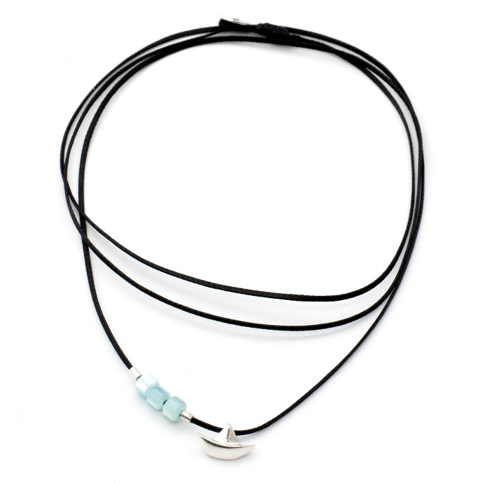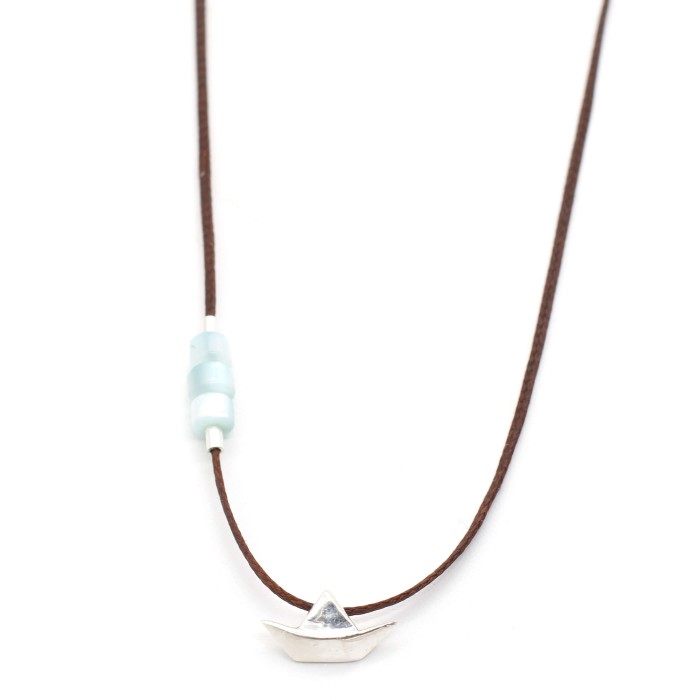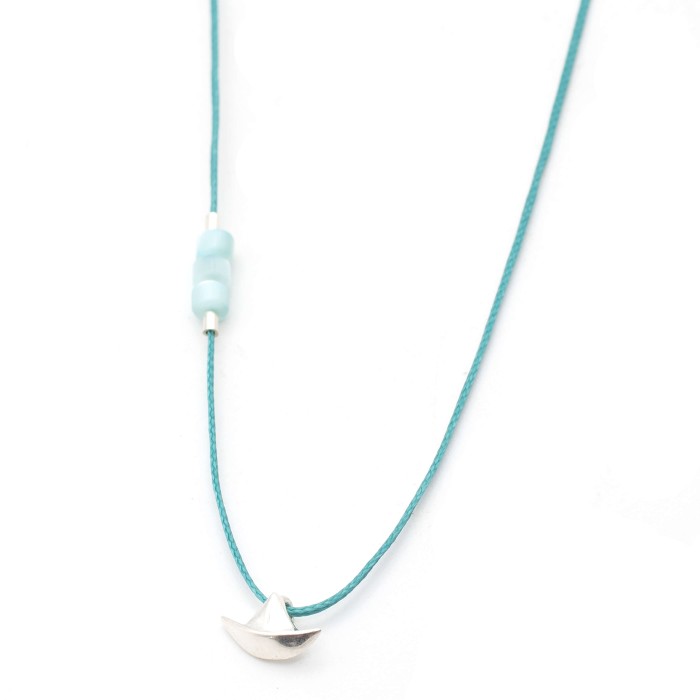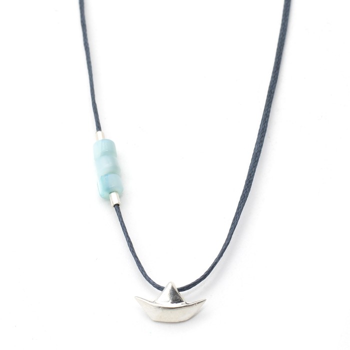 Ένα χειροποίητο κολιέ κατασκευασμένο από κηροκλωστή, ημιπολύτιμες πέτρες όστρακου και ασήμι 925. Το ασημένιο στοιχείο με το βαρκάκι που διακοσμεί το κολιέ είναι το κύριο χαρακτηριστικό του (διαστάσεις ~1,0 εκ * 0,5 εκ). Το κούμπωμα είναι κατασκευασμένο επίσης από ασήμι 925 και το κολιέ είναι ρυθμιζόμενου μεγέθους (μέγιστο ~60εκ).