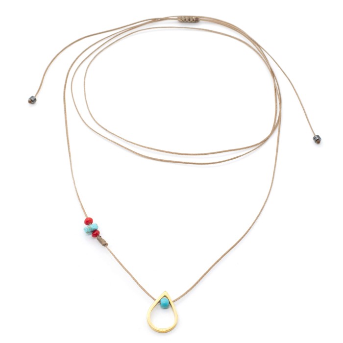 Ένα χειροποίητο κολιέ κατασκευασμένo από κηροκλωστή, ημιπολύτιμες πέτρες τυρκουάζ, κοράλλι & αιματίτη και επιχρυσωμένο ασήμι 925. Το ασημένιο στοιχείο που διακοσμεί το κολιέ είναι το κύριο χαρακτηριστικό του και έχει διαστάσεις ~2*1,2 εκ. Το κολιέ διαθέτει κούμπωμα μακραμέ και είναι αυξομειούμενου μεγέθους. Το μινιμαλ αυτό κόσμημα είναι μοναδικής κομψότητας και σικ αισθητικής.