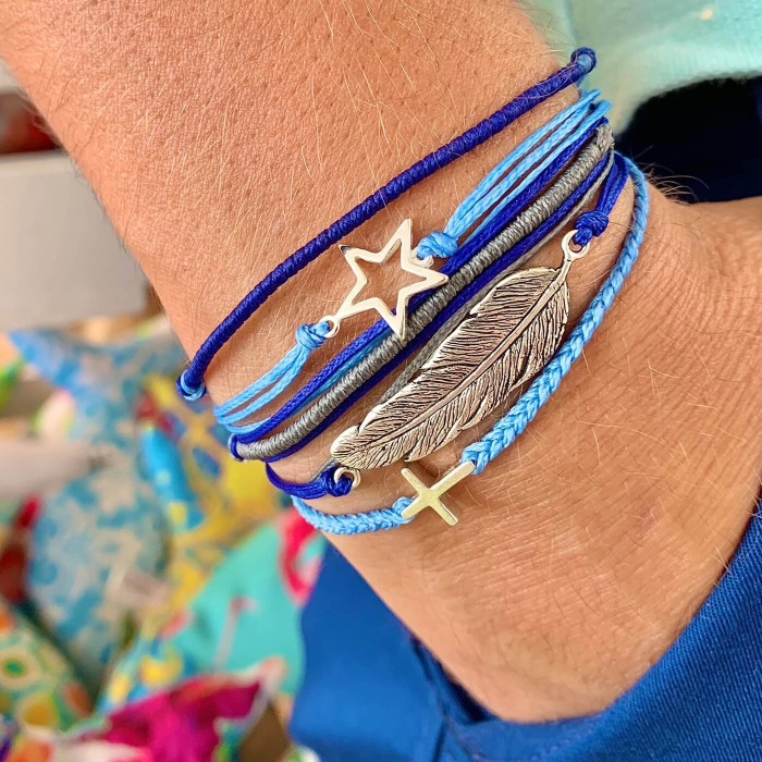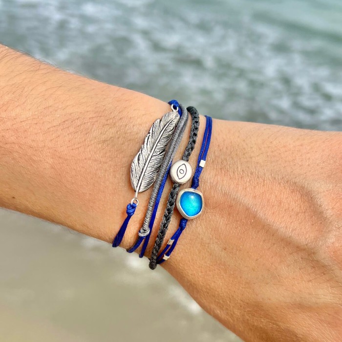 Ένα χειροποίητο βραχιόλι από μπλέ ρουά και γκρί κηροκλωστή που προσαρμόζεται στο μέγεθος που επιθυμείτε. Το μοτίφ (3,5cm) με το φτερό όπως και το κούμπωμα είναι από ασήμι 925.