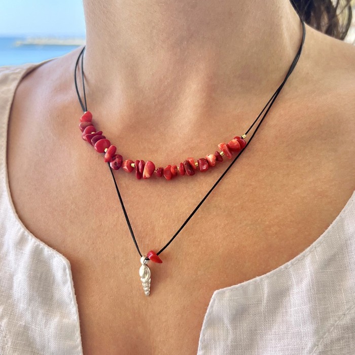 Ένα χειροποίητο κολιέ κατασκευασμένο με ημιπολύτιμες πέτρες και ασήμι 925. Ο μοναδικός χρωματισμός των φυσικών ημιπολύτιμων λίθων δημιουργεί ένα κόσμημα ξεχωριστό (Kόκκινο - Όστρακο, Τυρκουάζ - Τυρκουάζ, Ασημί - Αιματίτης, Πράσινο- Όστρακο, Multicolor - Όστρακο). Όλα τα επιχρυσωμένα στοιχέια του κολιέ έιναι κατασκευασμένα από ασήμι 925. Το κολιέ είναι ρυθμιζόμενου μεγέθους (μέγιστο ~60 εκ.).