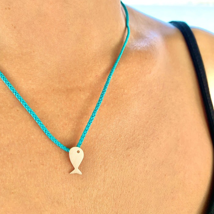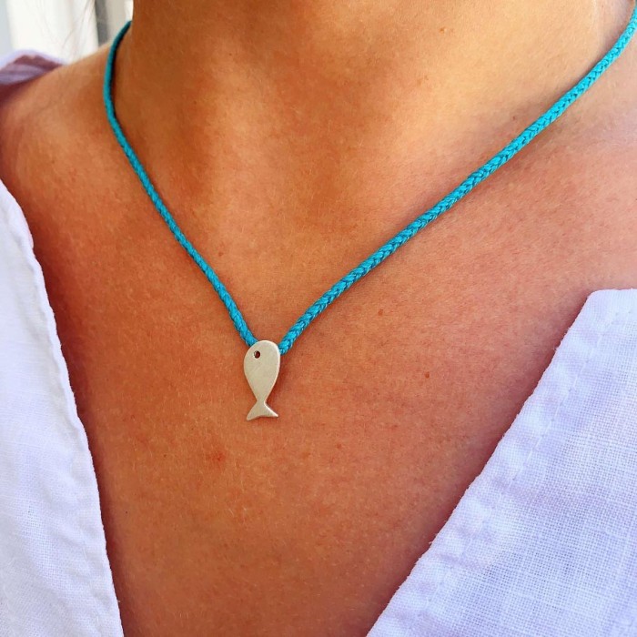 Ενα χειροποίητο πλεκτό κολιέ από τυρκουάζ κορδόνι με αυξομειούμενο μήκος (μέγιστο 25cm). Το ψαράκι (1*0,5cm) και το κούμπωμα είναι από ασήμι 925.
