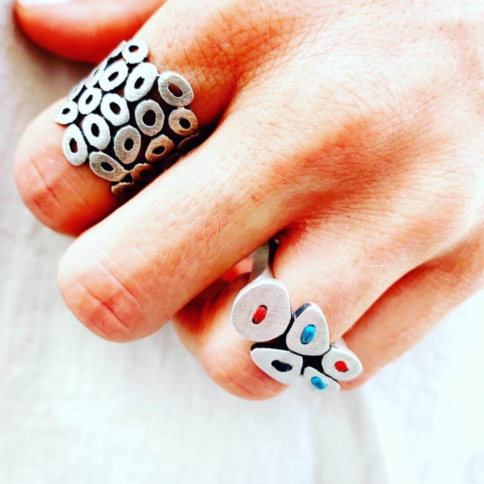 Ένα χειροποίητο εντυπωσιακό δαχτυλίδι με σχήματα και διακριτικές λεπτομέρεις από κλωστή σε ποικιλία χρωμάτων, από ασήμι 925.