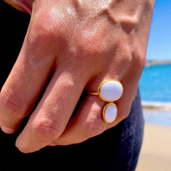 'Ενα εξαιρετικό χειροποίητο δαχτυλίδι από επιχρυσωμένο ασήμι 925 και λευκό σμάλτο (διαστάσεις οβάλ στοιχείων: ~1,5*1cm και ~1*0,8cm). Το στυλ του είναι αρχοντικό και συνάμα απλό. Το μέγεθος του δαχτυλιδιού προσαρμόζεται από 54 έως 58.