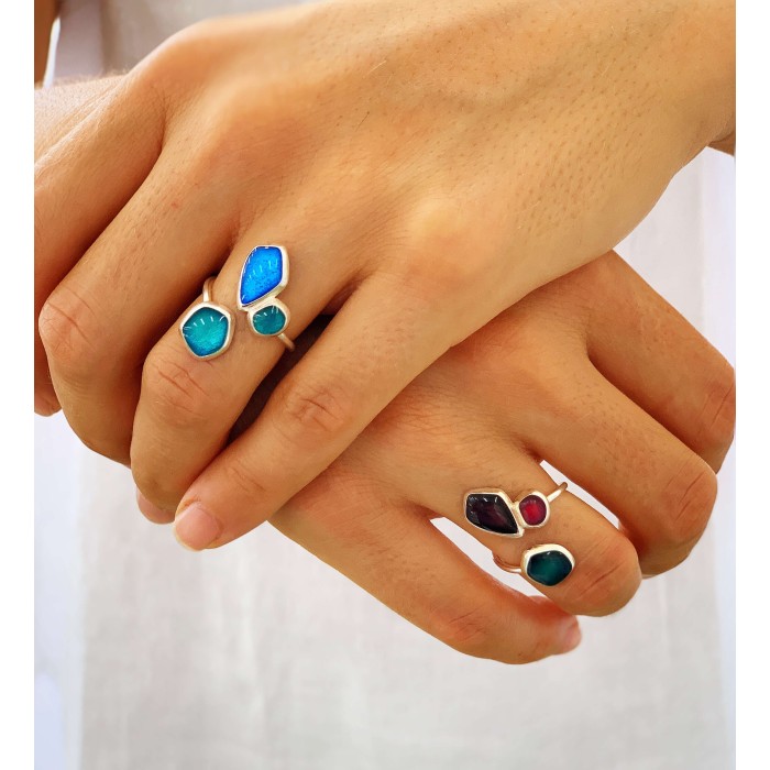 Χειροποίητο δαχτυλίδι της σειράς "Seaglass",με αυξομειούμενο μέγεθος από ασήμι 925 και λεπτομέρειες από σμάλτο σε πετρόλ, μώβ και γκρί.