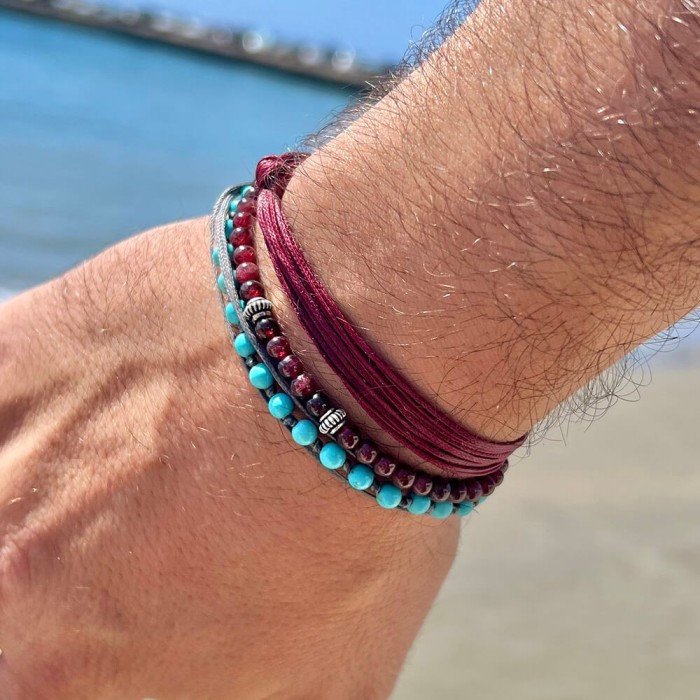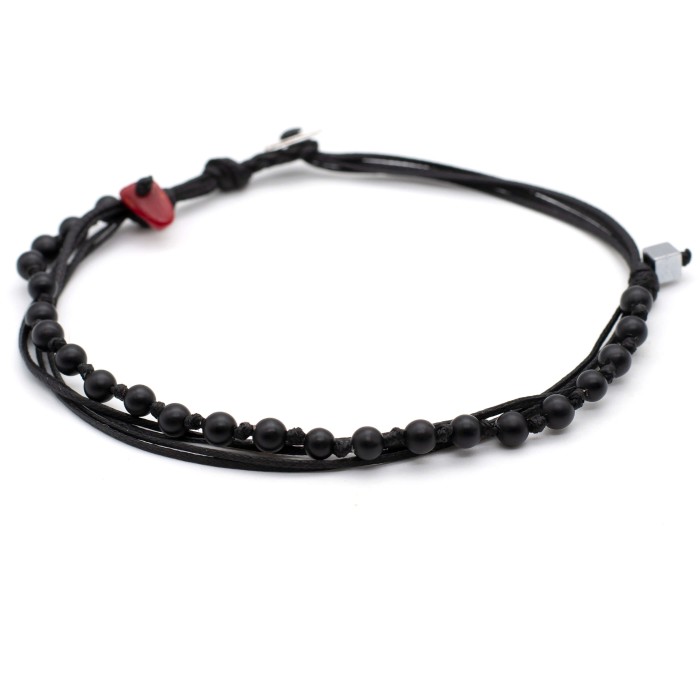 Ένα χειροποίητο βραχιόλι από κηροκλωστή υψηλής ποιότητας . Οι ημιπολύτιμες πέτρες που συνοδέυουν το κόσμημα είναι τυρκουάζ ή 'ονυχα (τυρκουάζ ή μαύρο) και ένα κόκκινο κοράλλι. Το κούμπωμα του βραχιολιού είναι κατασκευασμένο από ασήμι 925 και το μέγεθός του είναι ρυθμιζόμενο.