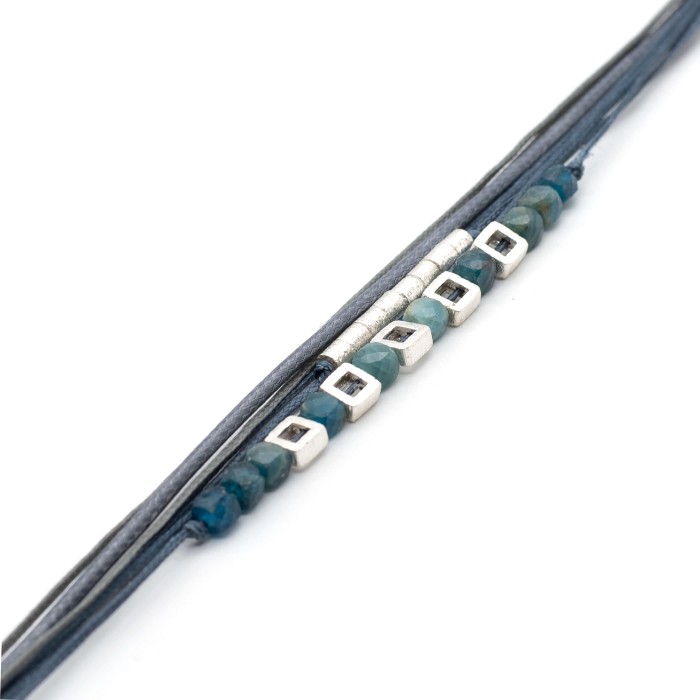 Ένα χειροποίητο βραχιόλι από κηροκλωστές και snake cords, που προσαρμόζεται στο μέγεθος που επιθυμείτε. Οι ημιπολύτιμοι λίθοι είναι από εντυπωσιακό απατίτη. 'Ολα τα στοιχεία του βραχιολιού είναι κατασκευασμένα από ασήμι 925. Ένα κόσμημα μίνιμαλ αισθητικής που προσφέρει ένα στυλ μοναδικό και διαφορετικό.