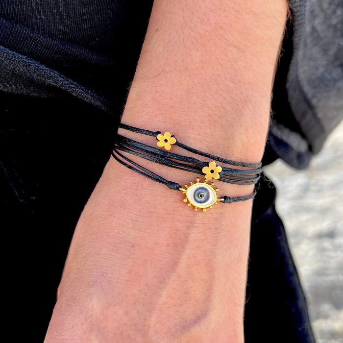 Ένα χειροποίητο βραχιόλι της σειράς "Ματάκι Μου", με μαύρο κορδόνι και μακραμέ κούμπωμα για αυξομειούμενο μέγεθος.Το μοτίφ έχει ως κύριο χαρακτηριστικό ένα καλοσχεδιασμένο μάτι με χαρακτηριστικές βλεφαρίδες και περιέχει σμάλτο και είναι κατασκευσμένο επιχρυσωμένο ασήμι 925. Μοναδικής κομψότητας αυτό το διακριτικό κόσμημα το οποιό μπορεί να προσφέρει ένα ιδιαίτερο και σικάτο τόνο στο καθημερινό σας outfit.