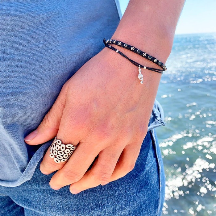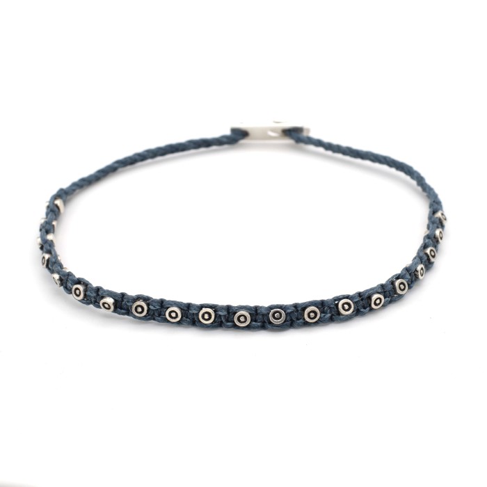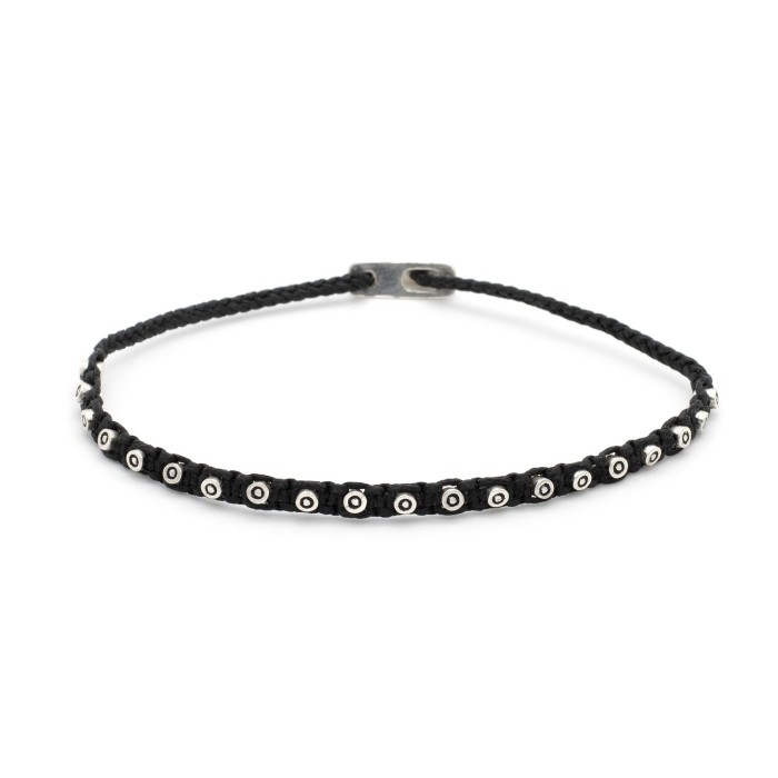 Ένα πλεκτό χειροποίητο βραχιόλι από μαύρο κορδόνι που προσαρμόζεται στο μέγεθος που επιθυμείτε. Τα ματάκια όπως και το κούμπωμα είναι από ασήμι 925.