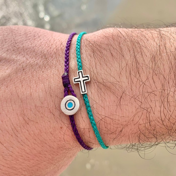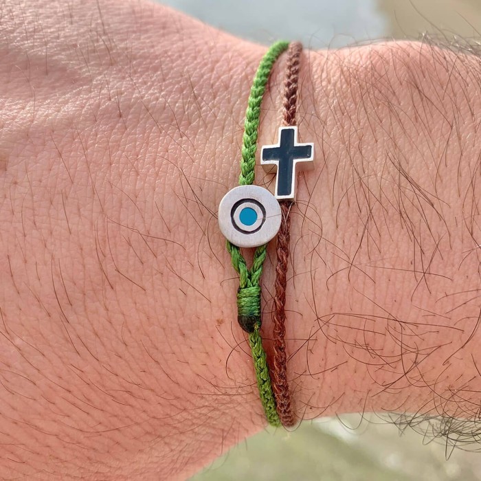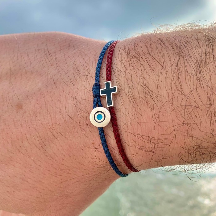 Ένα πλεκτό χειροποίητο βραχιόλι από κηροκλωστή που προσαρμόζεται στο μέγεθος που επιθυμείτε. Το ματάκι, το οποίο αποτελεί και το κούμπωμα του βραχιολιού, είναι από ασήμι 925.