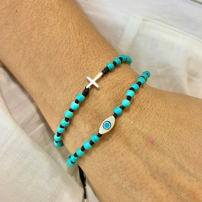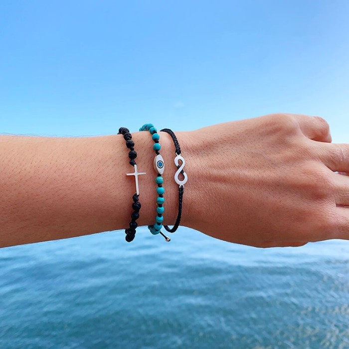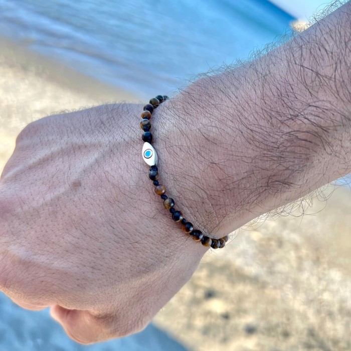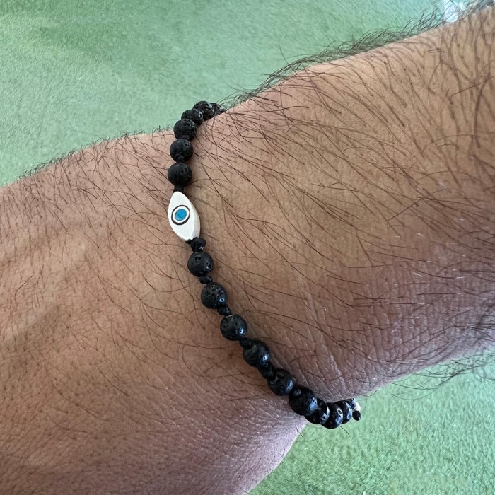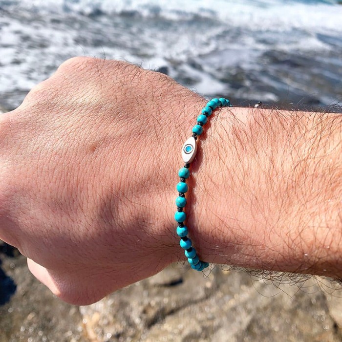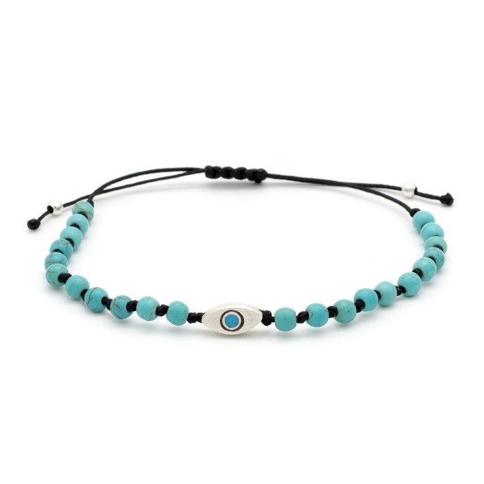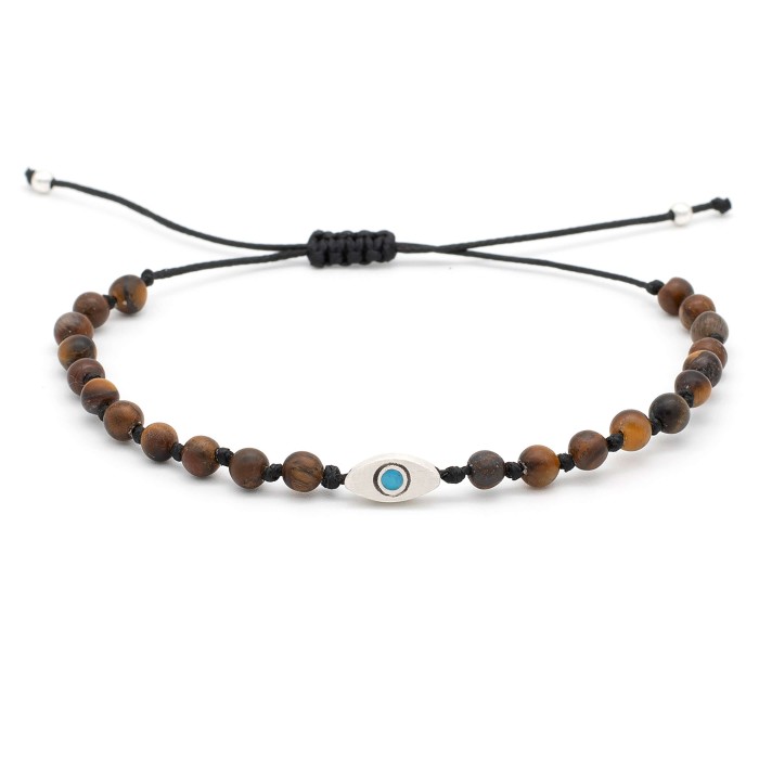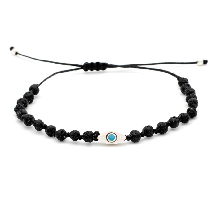 Ένα χειροποίητο βραχιόλι πλεγμένο με ημιπολύτιμες πέτρες και μακραμέ κούμπωμα. Το ματάκι και οι λεπτομέρειες είναι από ασήμι 925. Το μέγεθός του ειναι ONE SIZE.