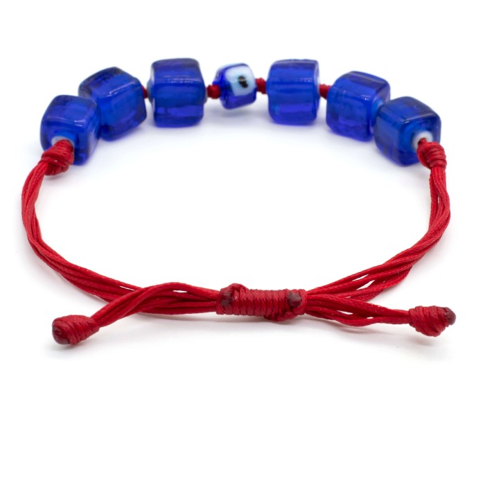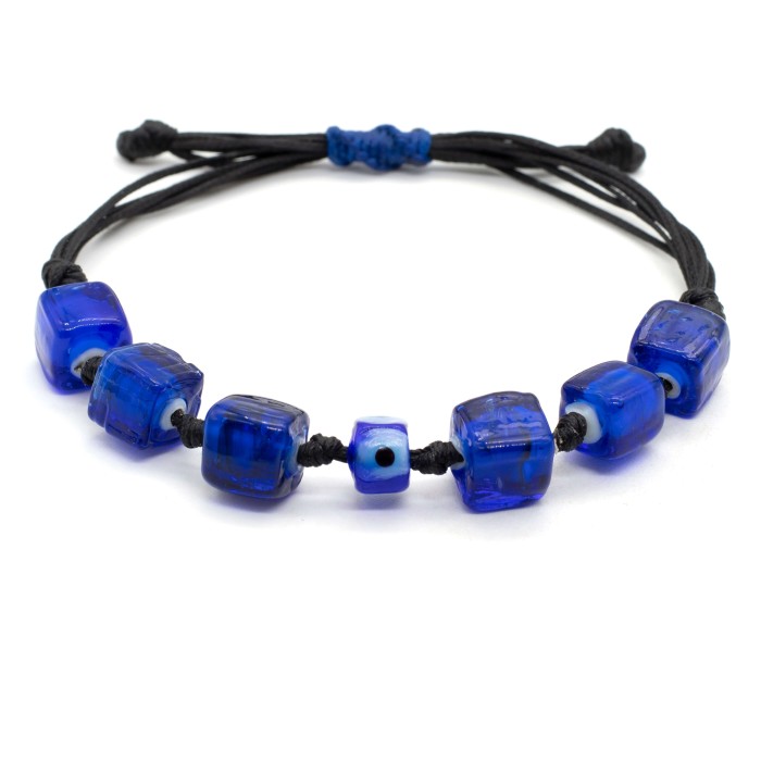 Το βραχιόλι "Αιγαίο" εμπνέεται από τα γαλάζια νερά του Αιγαίου, με κυβικές χάντρες και ένα παραδοσιακό ματάκι. Διαθέτει ανθεκτική κηροκλωστή και ρυθμιζόμενο μακραμέ κούμπωμα, συνδυάζοντας παράδοση και σύγχρονη αισθητική.