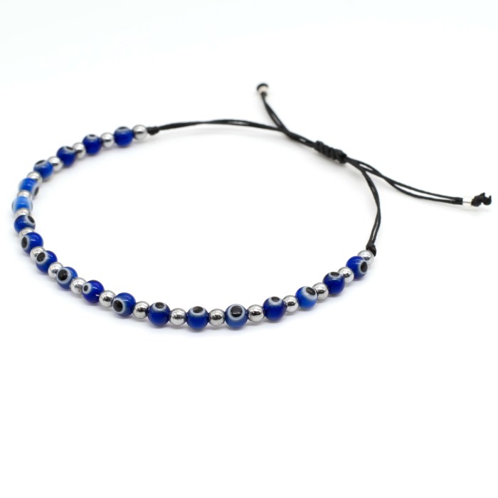 Το βραχιόλι "Σιγά μη με ματιάσεις" συνδυάζει προστασία και χιούμορ, με ένα σχεδιασμό που κερδίζει τις εντυπώσεις. Οι γυάλινες χάντρες με ματάκι σε τυρκουάζ ή βαθύ μπλε χρώμα εναλλάσσονται με ημιπολύτιμους αιματίτες, δημιουργώντας μια δυναμική και μοντέρνα αισθητική. Το τελείωμα του βραχιολιού κοσμείται με διακριτικά στοιχεία από ασήμι 925, ενώ το ρυθμιζόμενο κούμπωμα τύπου μακραμέ εξασφαλίζει άνεση και προσαρμοστικότητα.