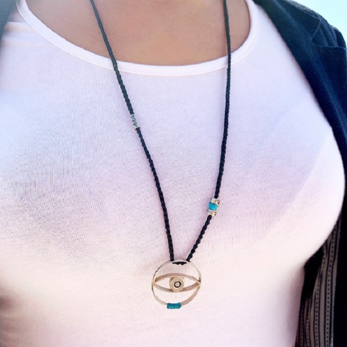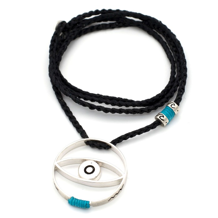 Ένα εντυπωσιακό χειροποίητο κολιέ πλεγμένης κηροκλωστής με ένα μεγάλο μάτι απο ασήμι 925. Το μήκος του κολιέ είναι ρυθμιζόμενο.