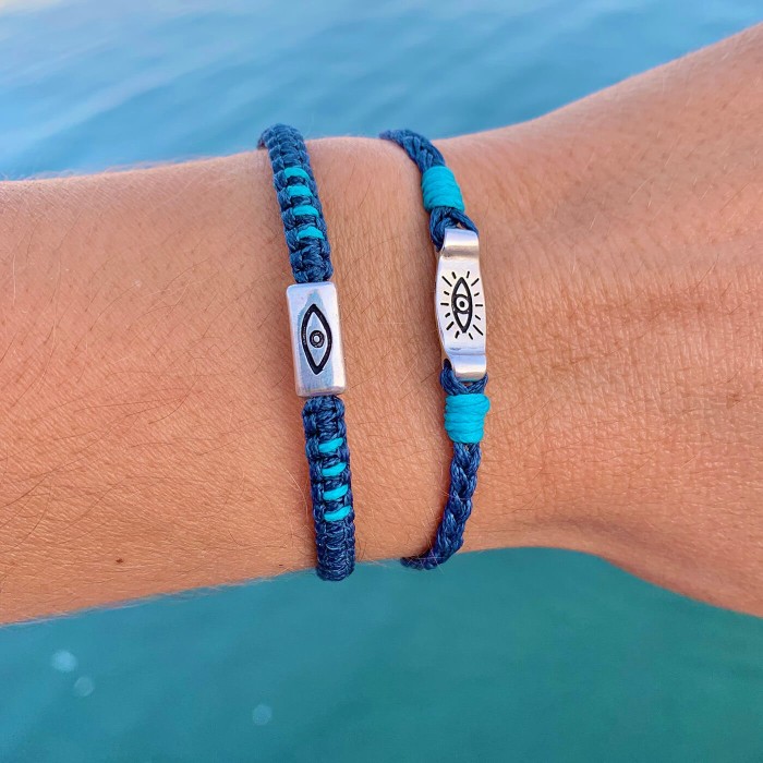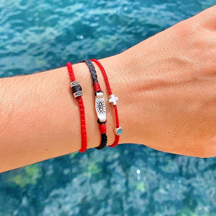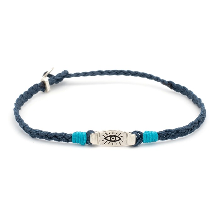 Ένα πρωτοποριακό βραχιόλι, μοναδικής σχεδίασης και κουλτούρας, κατασκευασμένο από ένα πλεγμένη κηροκλωστή. Το μάτι και το κούμπωμα είναι από ασήμι 925. Το βραχιόλι είναι αυξομειούμενου μεγέθους.