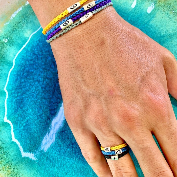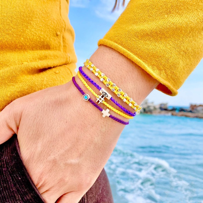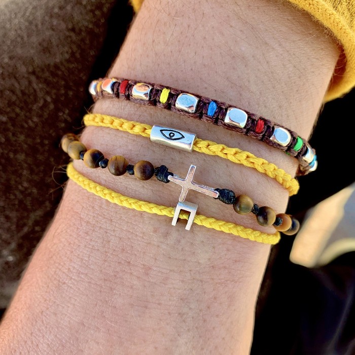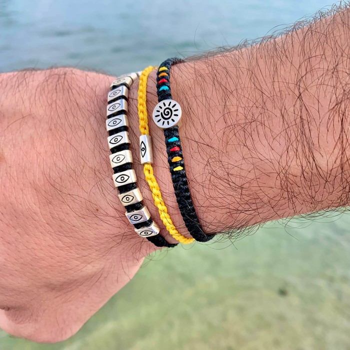 Ένα χειροποίητο βραχιόλι κατασκευασμένο με κίτρινη κηροκλωστή υψηλής ποιότητος. Το κεντρικό στοιχείο όπως και το κούμπωμα είναι κατασκευασμένα με ασήμι 925. Το βραχιόλι είναι αυξομειούμενου μεγέθους.