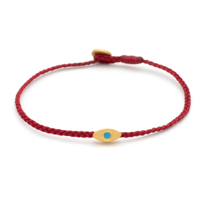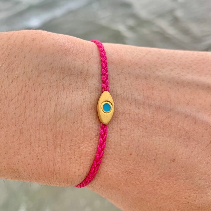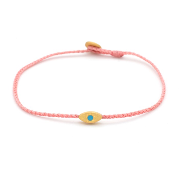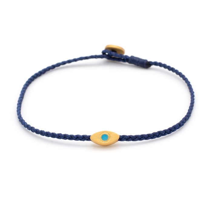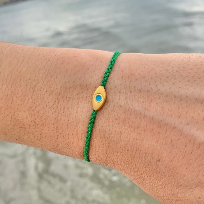 Ένα χειροποίητο πλεκτό βραχιόλι από κηροκλωστή που προσαρμόζεται στο μέγεθος που επιθυμείτε. Στυλ απλό, καθημερνό και ευκολοσυνδίαστο. Το ματάκι όπως και το κούμπωμα είναι από επίχρυσο ασήμι 925.