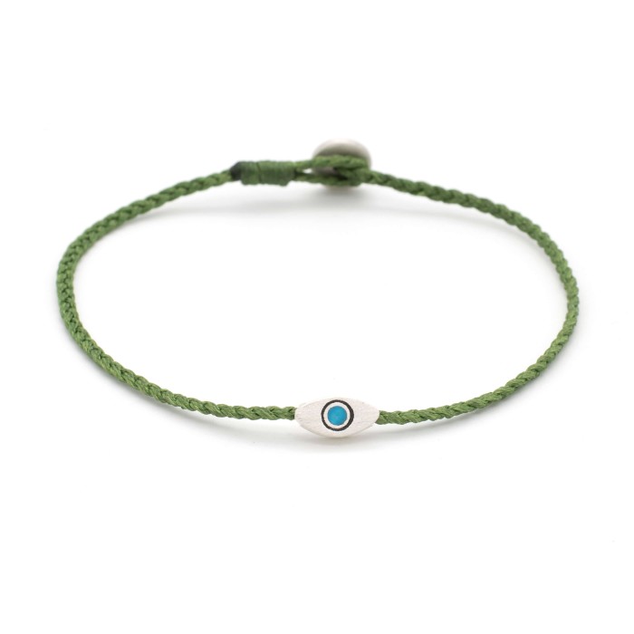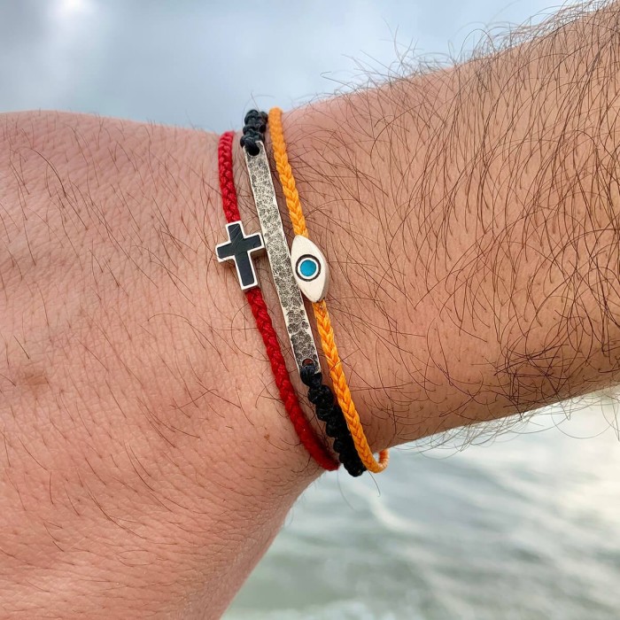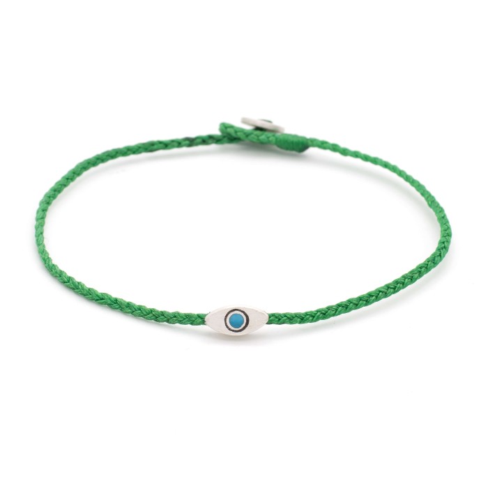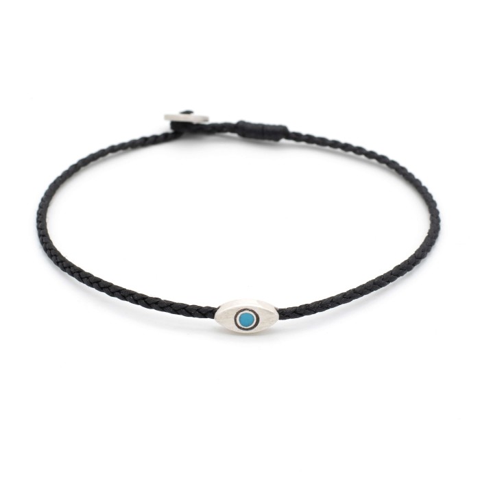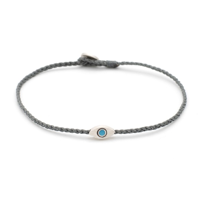 Ένα χειροποίητο πλεκτό βραχιόλι από κηροκλωστή που προσαρμόζεται στο μέγεθος που επιθυμείτε. Στυλ απλό, καθημερνό και ευκολοσυνδίαστο. Το ματάκι όπως και το κούμπωμα είναι από επίχρυσο ασήμι 925.