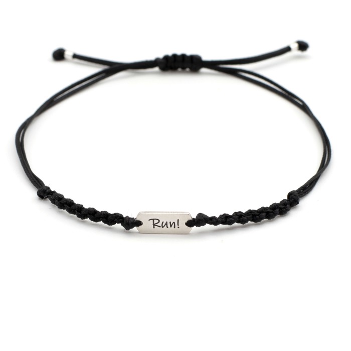 Το "Run!" είναι ένα χειροποίητο βραχιόλι από ανθεκτική κηροκλωστή, διαθέσιμο σε χρώμα της επιλογής σας, με ασημένια μπαρίτσα 925 χαραγμένη με το μήνυμα "Run!". Με ρυθμιζόμενο κλείσιμο μακραμέ, αποτελεί το ιδανικό αξεσουάρ για όσους αγαπούν τη δράση και την κίνηση.