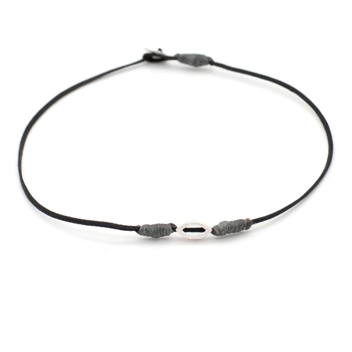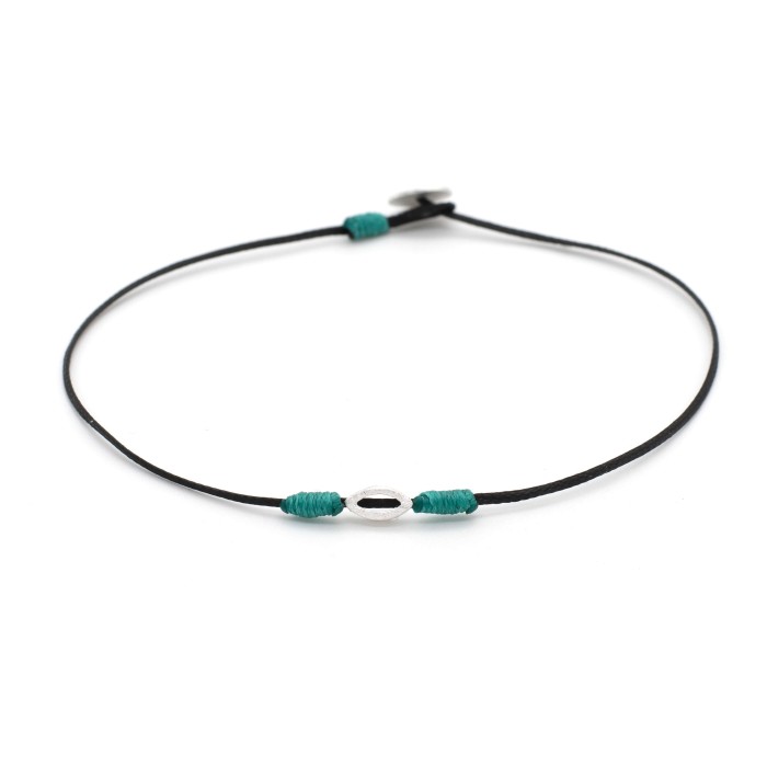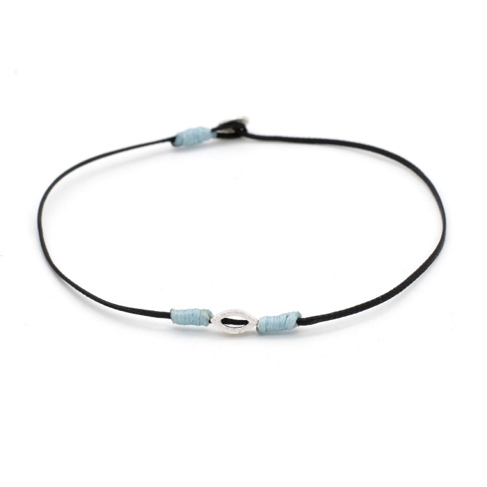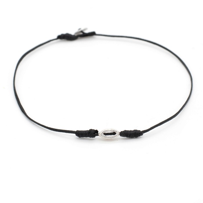 Ένα χειροποίητο βραχιόλι ποδιού κατασκευασμένo από κηροκλωστή και ασήμι 925. Το ασημένιο ματάκι που διακοσμεί το βραχιόλι είναι το κύριο χαρακτηριστικό του και έχει μήκος ~0,7εκ. Το κούμπωμα είναι κατασκευασμένο επίσης από ασήμι 925 και το βραχιόλι είναι αυξομειούμενου μεγέθους. Το μινιμαλ αυτό κόσμημα είναι μοναδικής κομψότητας και σικ αισθητικής.
