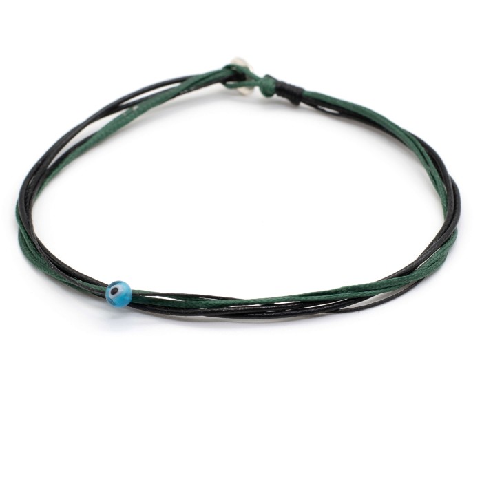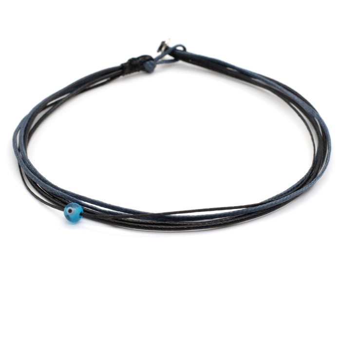 Ένα χειροποίητο βραχιόλι ποδιού από κηροκλωστές και snake cords, που προσαρμόζεται στο μέγεθος που επιθυμείτε (3 στο μαύρο χρώμα που είναι σταθερό και 2 ως χρώμα επιλογής). To μίνι ματάκι ,το οποία αποτελεί και το κεντρκό στοιχείο του βραχιολιού, κινείται ελέυθερα κατά μήκος του βραχιολιού. Ένα κόσμημα μίνιμαλ αισθητικής που προσφέρει ένα στυλ μοναδικό και διαφορετικό.