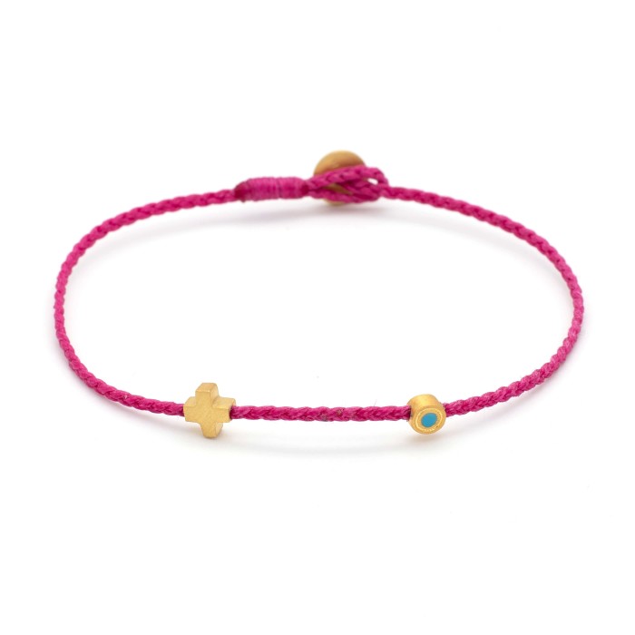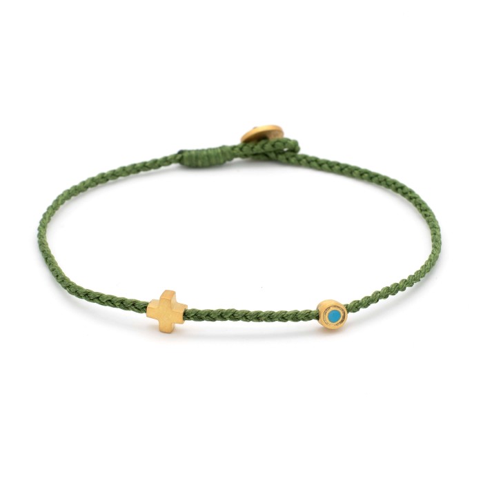 Ένα χειροποίητο πλεκτό βραχιόλι ποδιού από κηροκλωστή που προσαρμόζεται στο μέγεθος που επιθυμείτε. Το ματάκι, ο σταυρός και το κούμπωμα είναι από επιχρυσωμένο ασήμι 925.