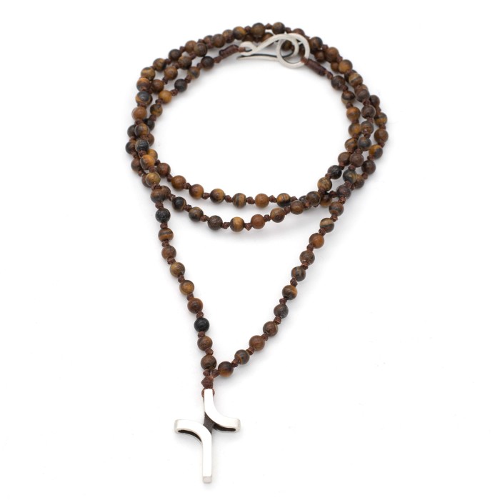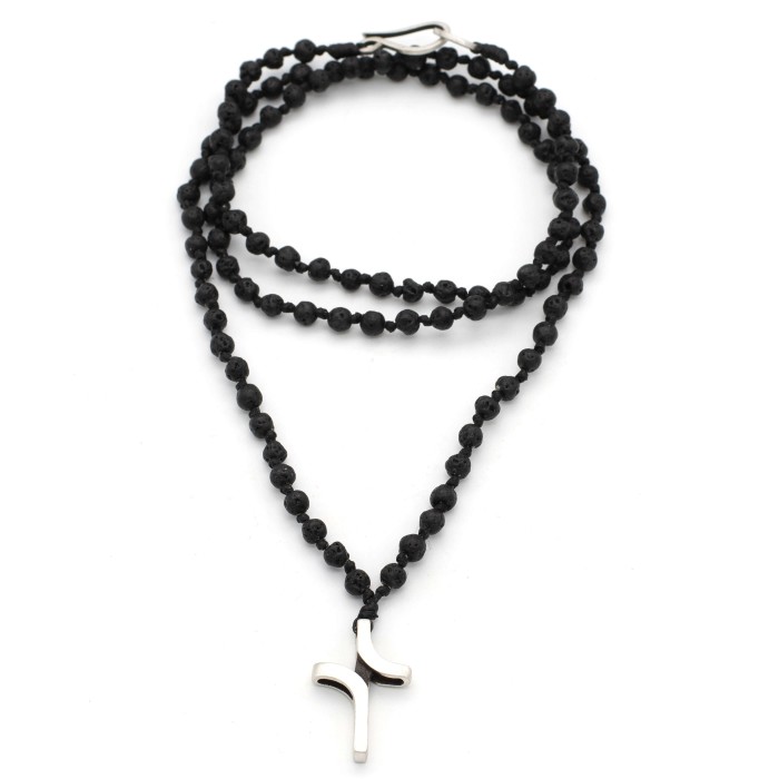 Ένα χειροποίητο ροζάριο (74cm) πλεγμένο με ημιπολύτιμες πέτρες (μαύρο - λάβα, τυρκουάζ - τυρκουάζ, καφέ - μάτι τίγρης) και ένα σταυρό (~2.5*1.7 cm) από ασήμι 925,ο οποίος έχει επεξεργαστεί με τη μέθοδο της οξείδωσης ώστε να επιτευχθεί η μάυρη όψη του μετάλλου σε κάποια σημεία. Το κούμπωμα - ματάκι είναι επίσης από ασήμι 925.