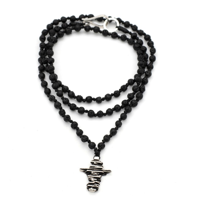 Ένα χειροποίητο ροζάριο (~74cm) πλεγμένο από ημιπολύτιμες πέτρες (μαύρο - λάβα, καφέ - μάτι τίγρη). Ο σταυρός (~2.3*2cm) και το κούμπωμα είναι κατασκευασμένα από ασήμι 925.