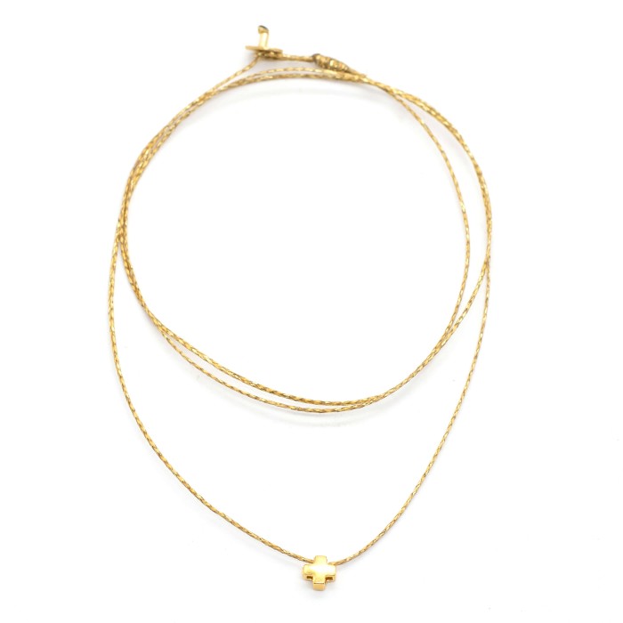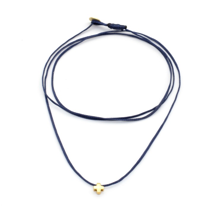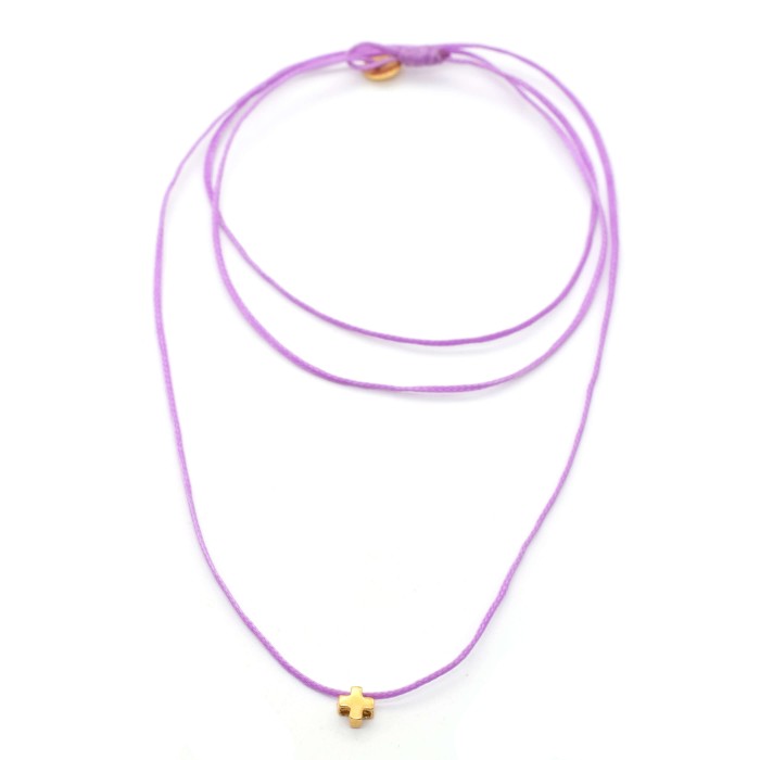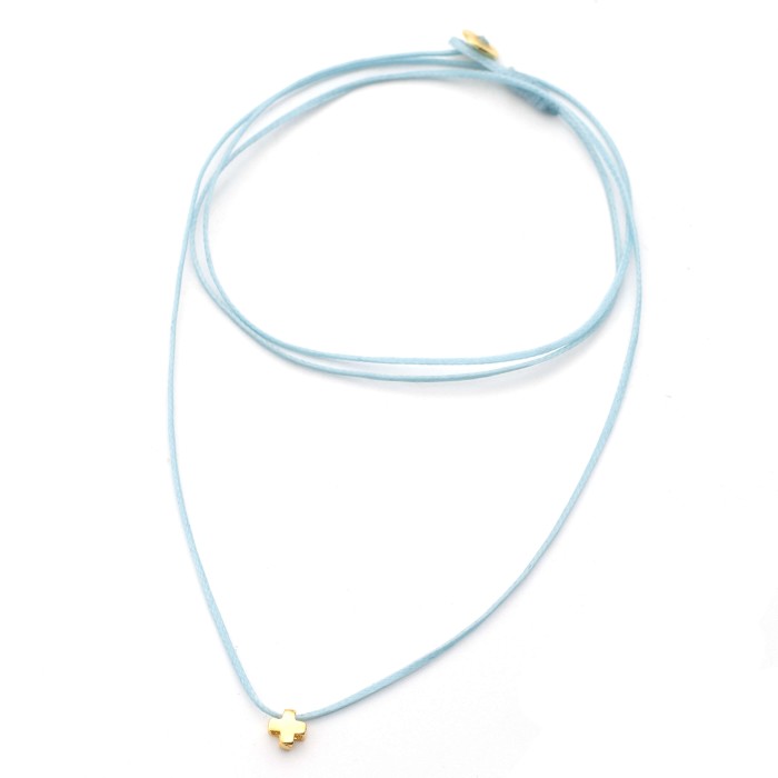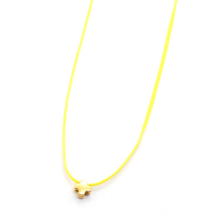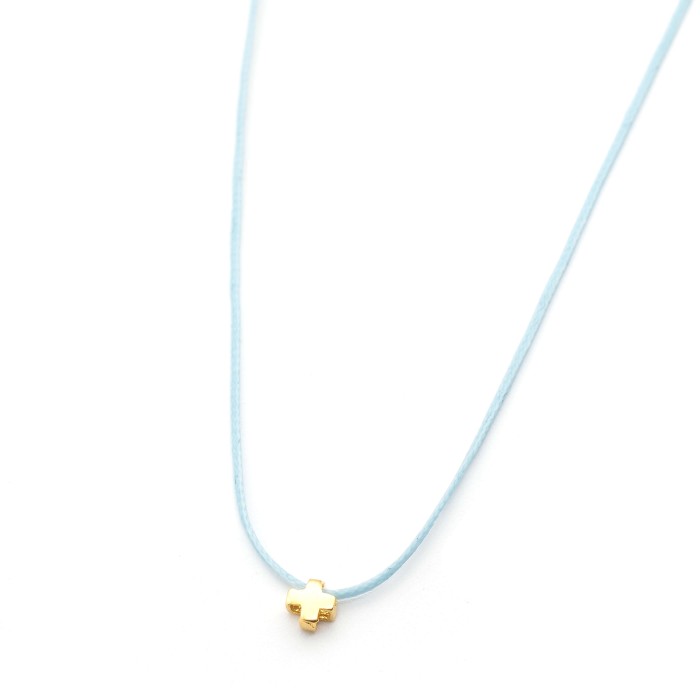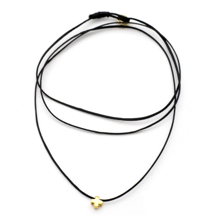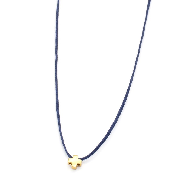 Ένα κολιέ που συνδυάζει την απλότητα με τη φινέτσα. Χειροποίητο, κατασκευασμένο από ανθεκτική κηροκλωστή, με κεντρικό στοιχείο ένα διακριτικό σταυρουδάκι από επιχρυσωμένο ασήμι 925 (διαστάσεις 0,4 x 0,4 εκ.), που αποπνέει μίνιμαλ αισθητική και κομψότητα.