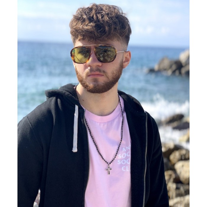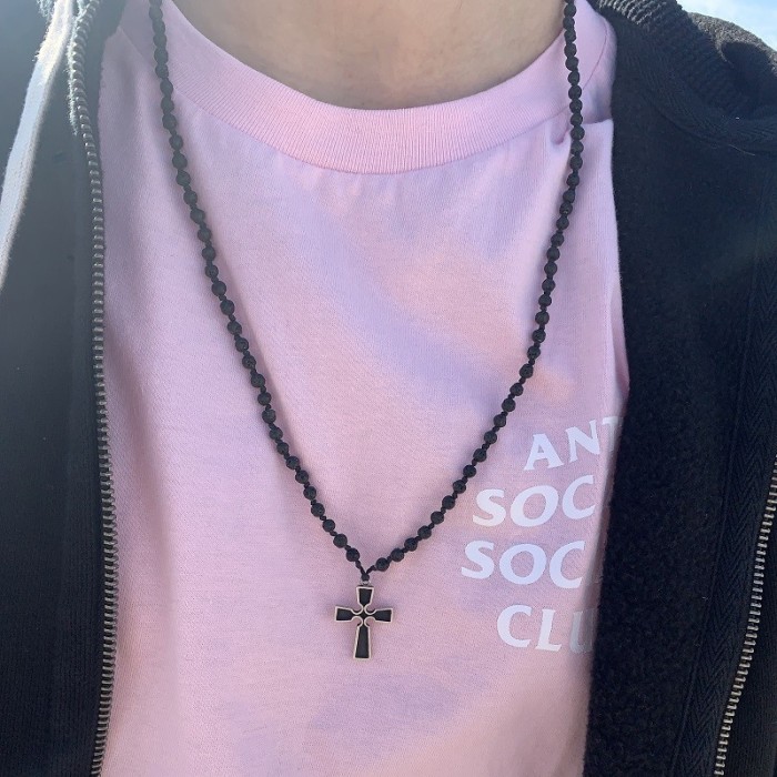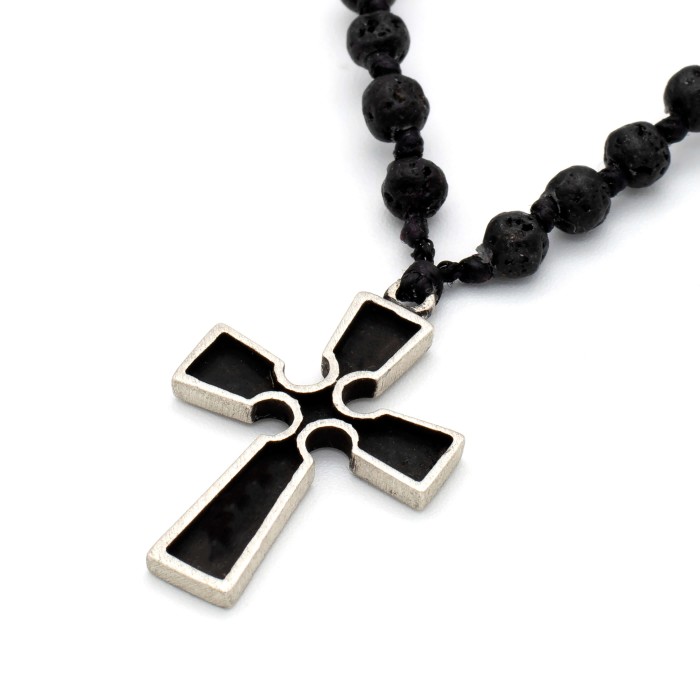 Ένα χειροποίητο ροζάριο (57cm) πλεγμένο με ηφαιστιακές πέτρες (λάβα) και ένα σταυρό (3*2cm) από ασήμι 925, ο οποίος έχει επεξεργαστεί με τη μέθοδο της οξείδωσης ώστε να επιτευχθεί η μάυρη όψη του μετάλλου σε κάποια σημεία. Ο σχεδιασμός του είναι κάθε άλλο παρά συνηθισμένος και παρατρέπει σε συνθήκες γοτθικές. Το κούμπωμα είναι επίσης από ασήμι 925.