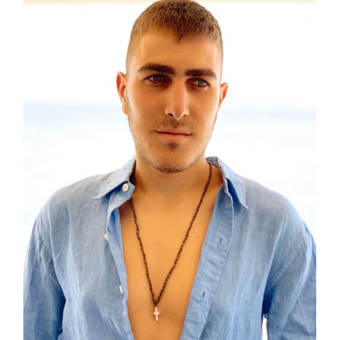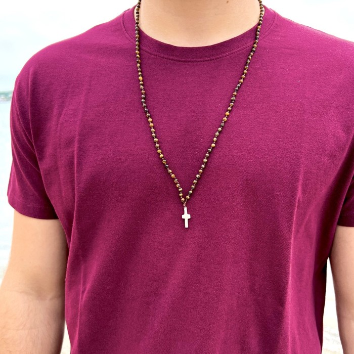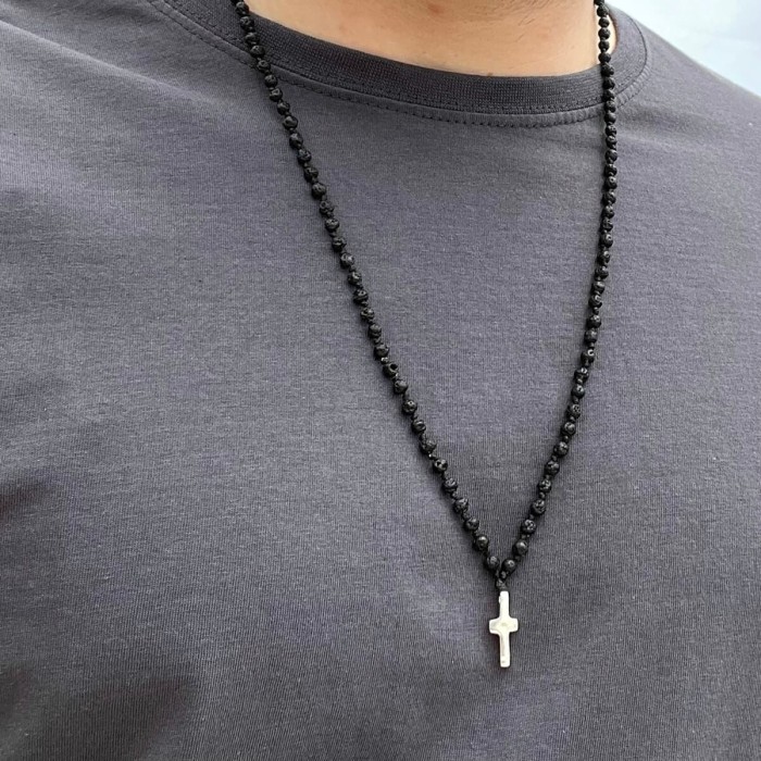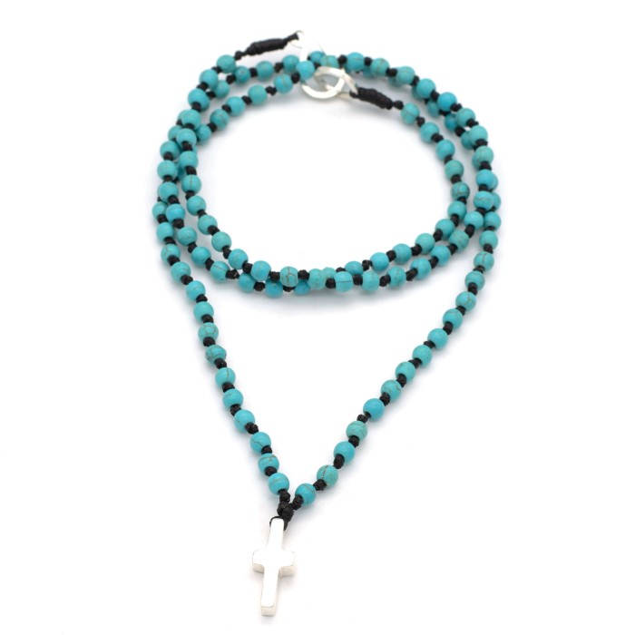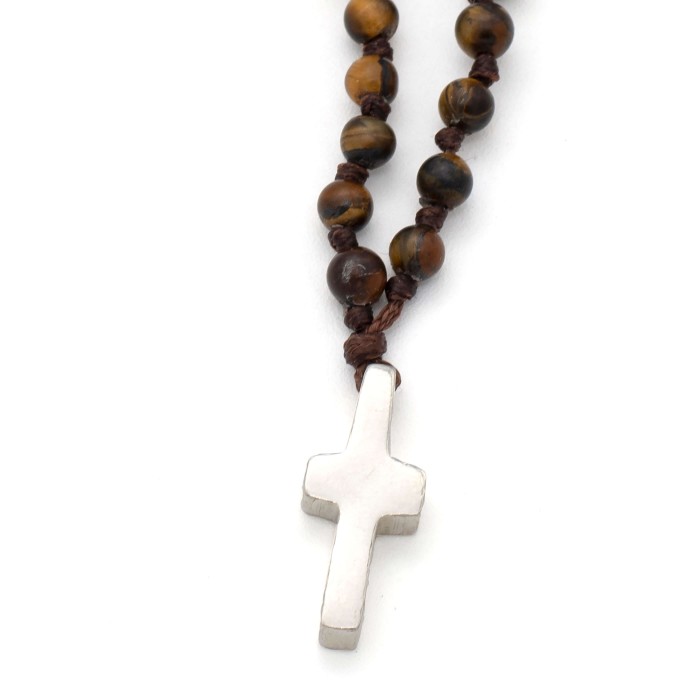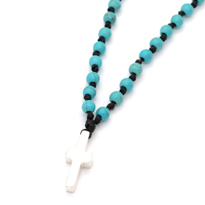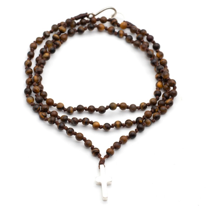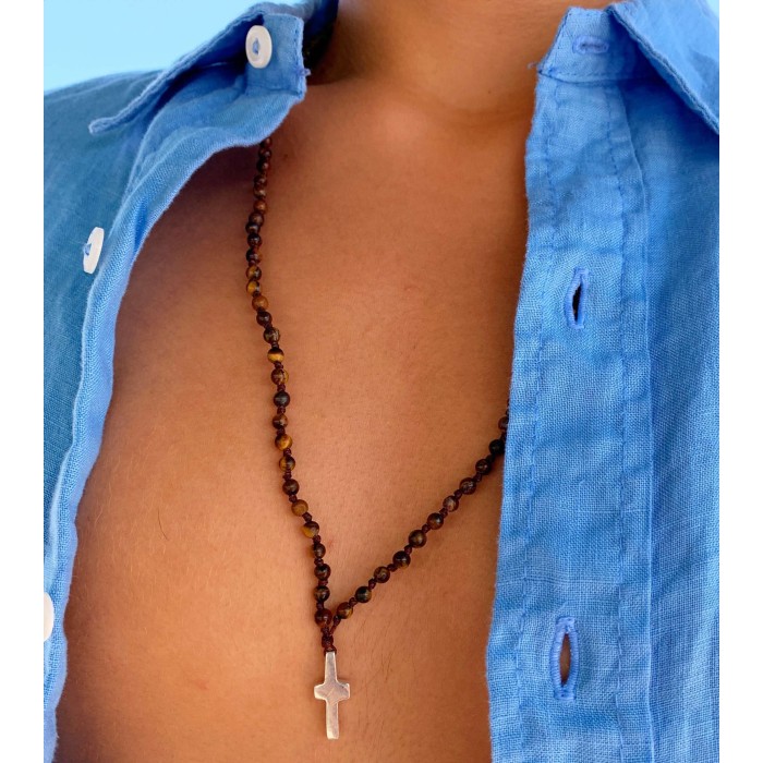 Ένα χειροποίητο ροζάριο (~74cm) πλεγμένο από ημιπολύτιμες πέτρες (μαύρο - λάβα, τυρκουάζ - τυρκουάζ, καφέ - μάτι τίγρη). Ο σταυρός (~2*1cm) και το κούμπωμα είναι κατασκευασμένα από ασήμι 925.