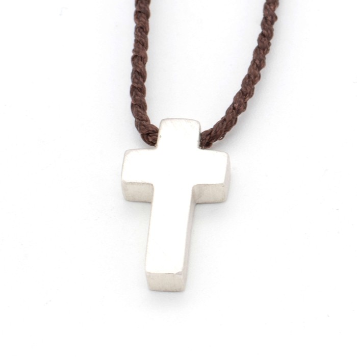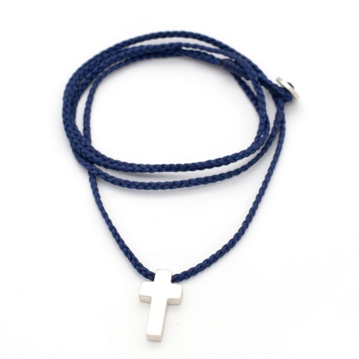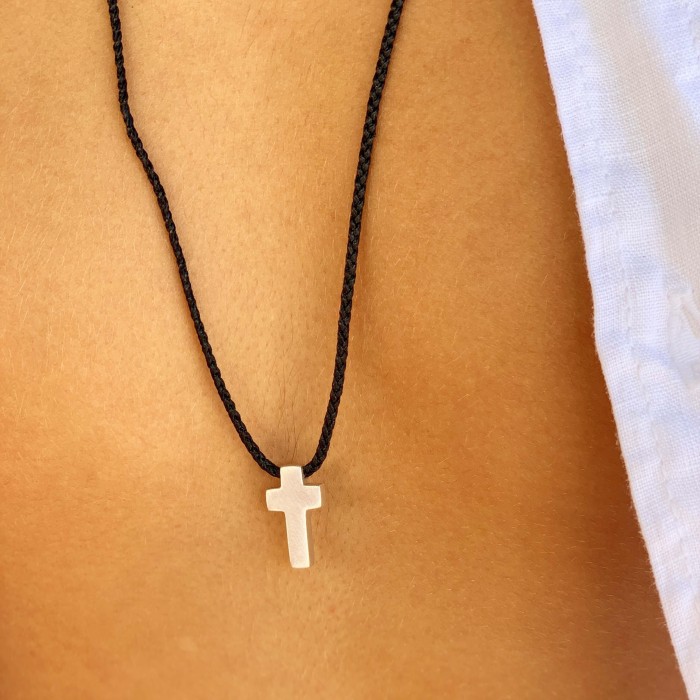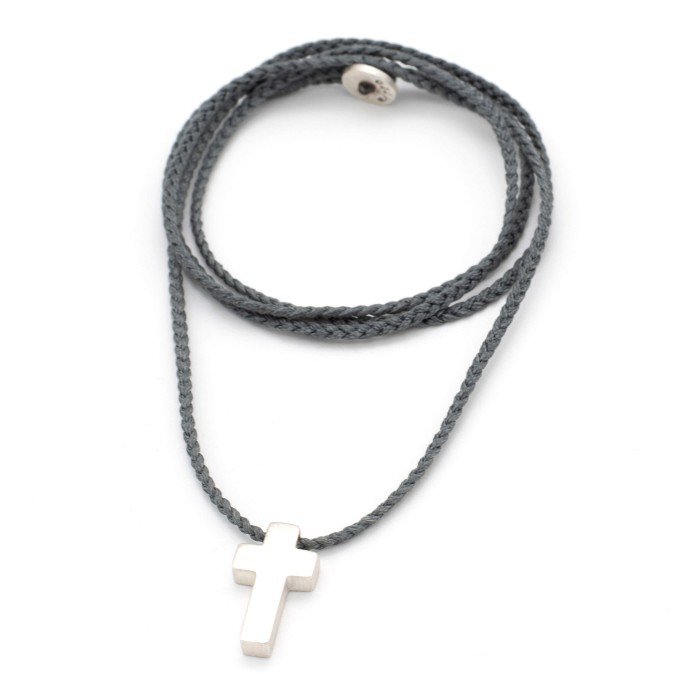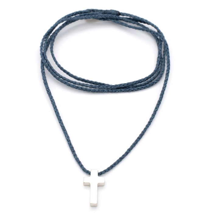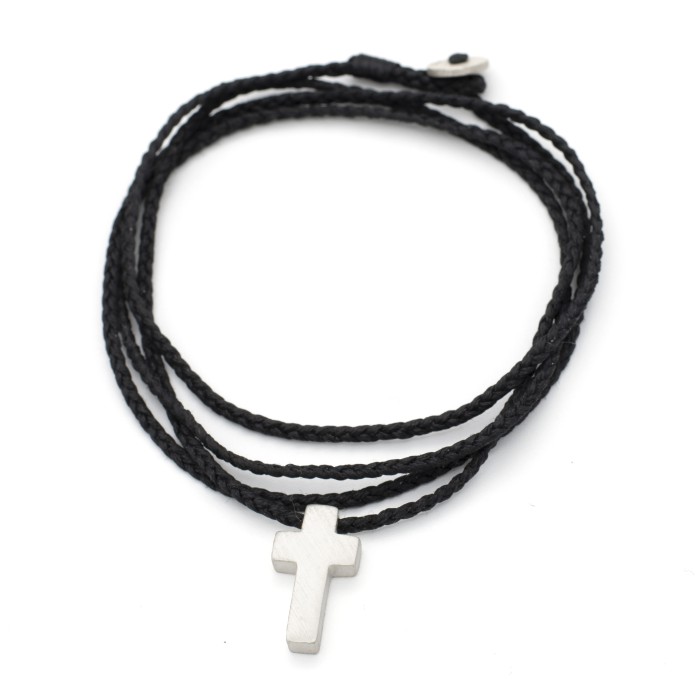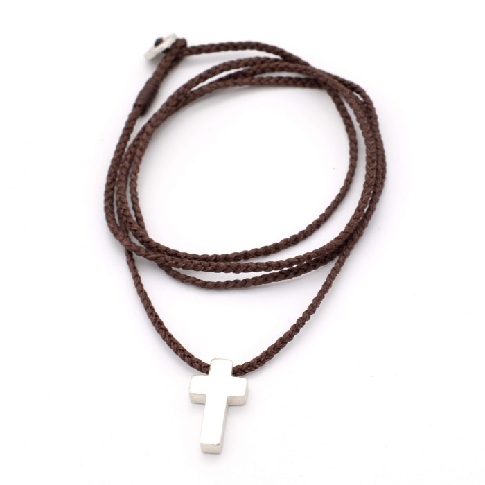 Ενα χειροποίητο κολιέ με πλεγμένη κηροκλωστή και αυξομειούμενο μήκος (μέγιστο ~70cm). Ο σταυρός (~2*1cm) και το κούμπωμα είναι από ασήμι 925.