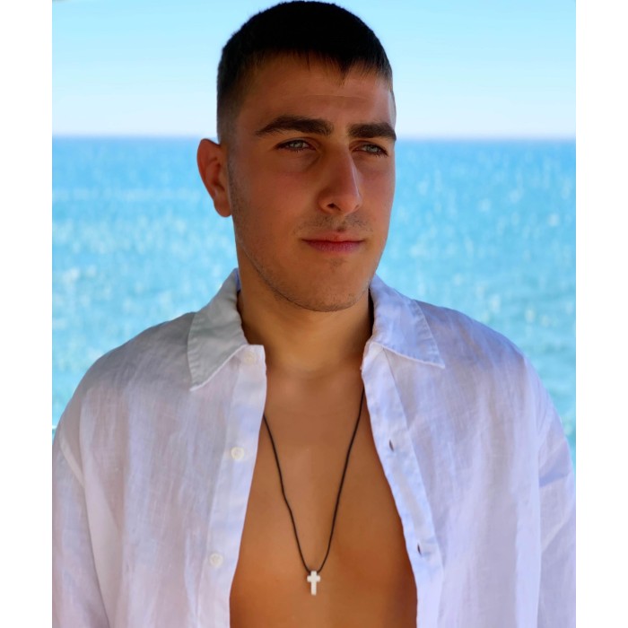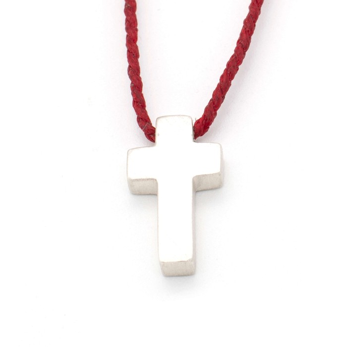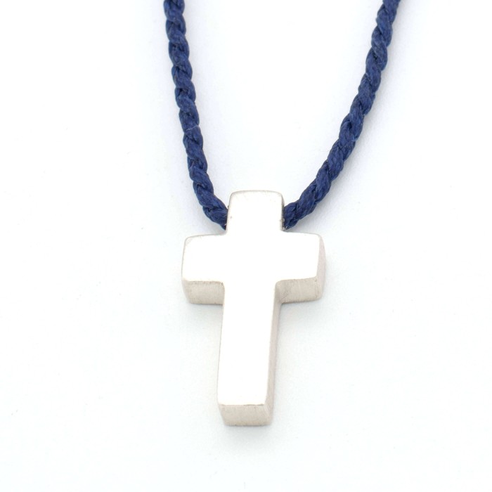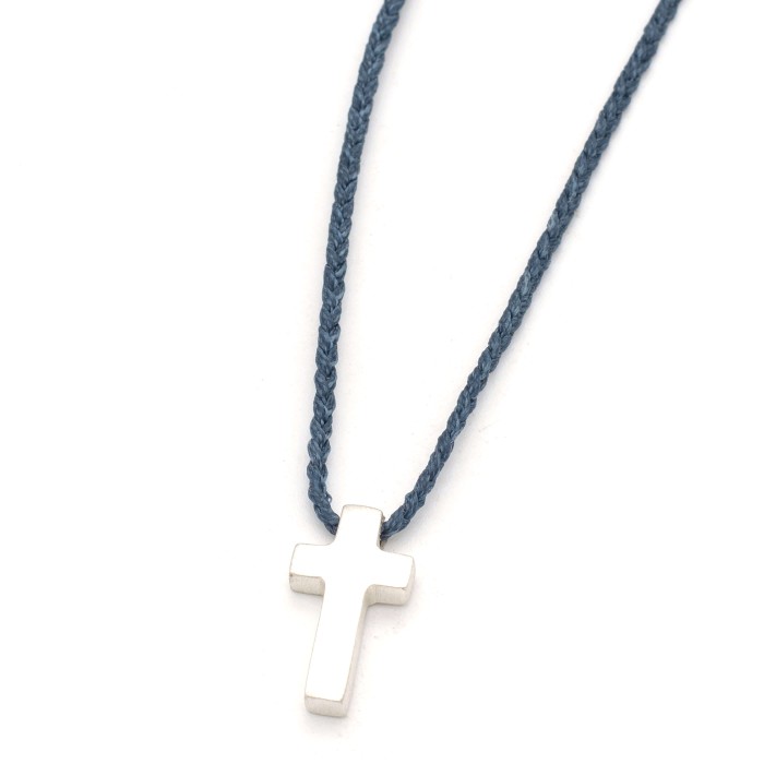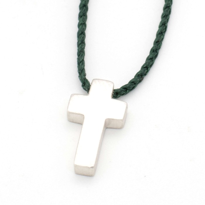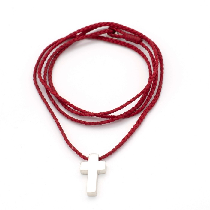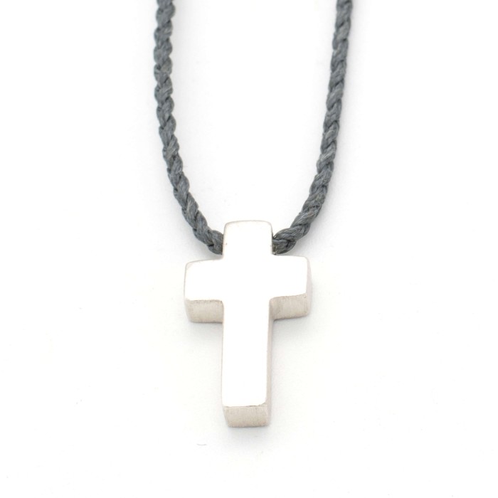 Ενα χειροποίητο κολιέ με πλεγμένη κηροκλωστή και αυξομειούμενο μήκος (μέγιστο ~70cm). Ο σταυρός (~2*1cm) και το κούμπωμα είναι από ασήμι 925.