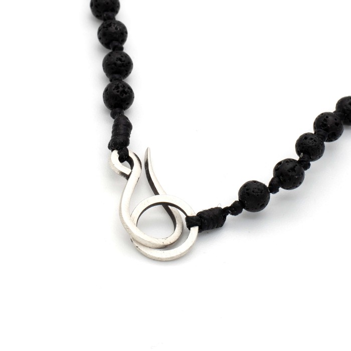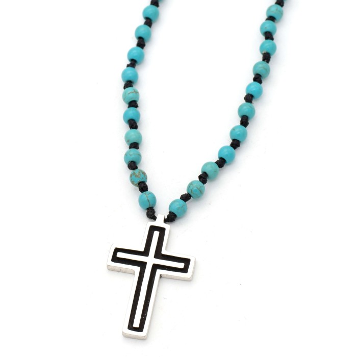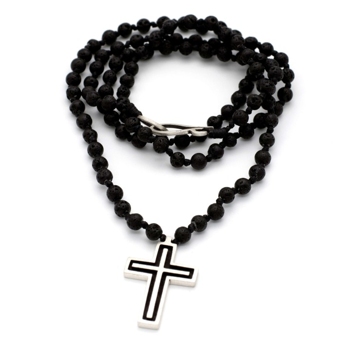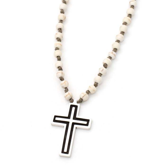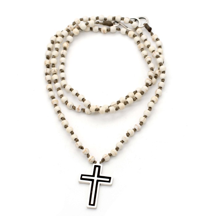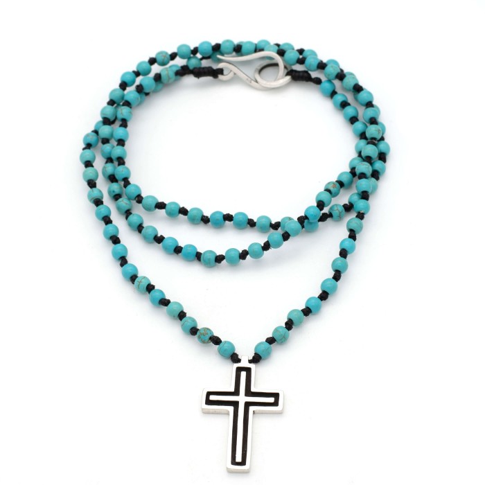 Ένα χειροποίητο ροζάριο (74cm) πλεγμένο με ημιπολύτιμες πέτρες (μαύρο - λάβα, τυρκουάζ - τυρκουάζ, λευκό - χαολίτης) και ένα σταυρό (3*2cm) από ασήμι 925,ο οποίος έχει επεξεργαστεί με τη μέθοδο της οξείδωσης ώστε να επιτευχθεί η μάυρη όψη του μετάλλου σε κάποια σημεία. Το κούμπωμα είναι επίσης από ασήμι 925.