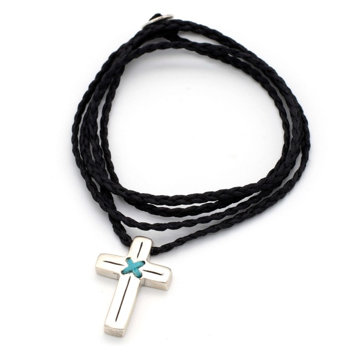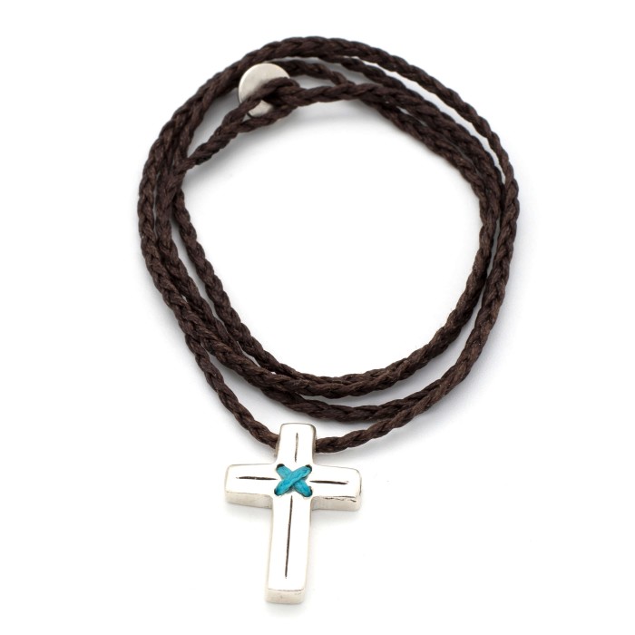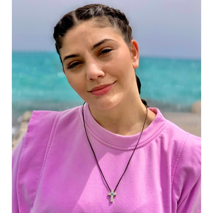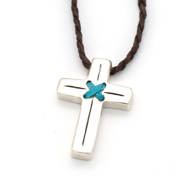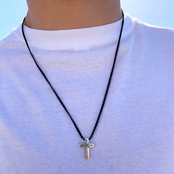 Ενα χειροποίητο κολιέ με πλεγμένες κηροκλωστές και αυξομειούμενο μήκος (μέγιστο ~34cm). Ο σταυρός (2,4*1,7cm) και το κούμπωμα είναι από ασήμι 925.
