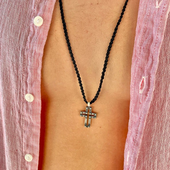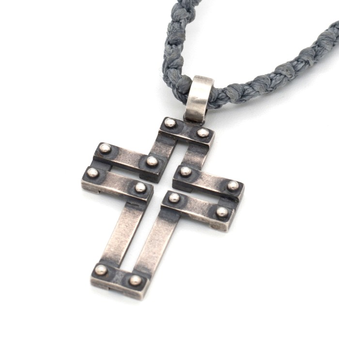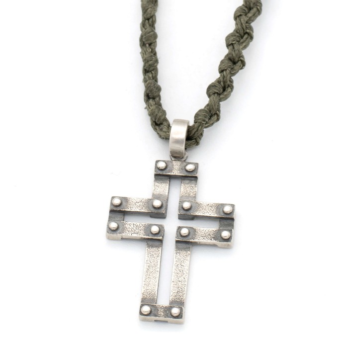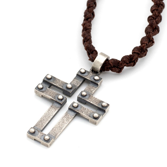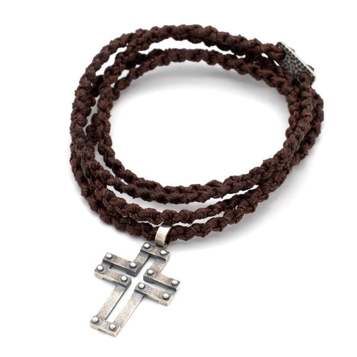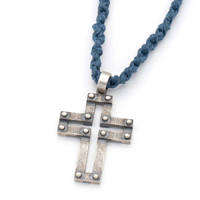 Ενα χειροποίητο κολιέ με πλεγμένη κηροκλωστή και αυξομειούμενο μήκος (μέγιστο ~74cm). Ο σταυρός (3*2cm) και το κούμπωμα είναι από ασήμι 925.