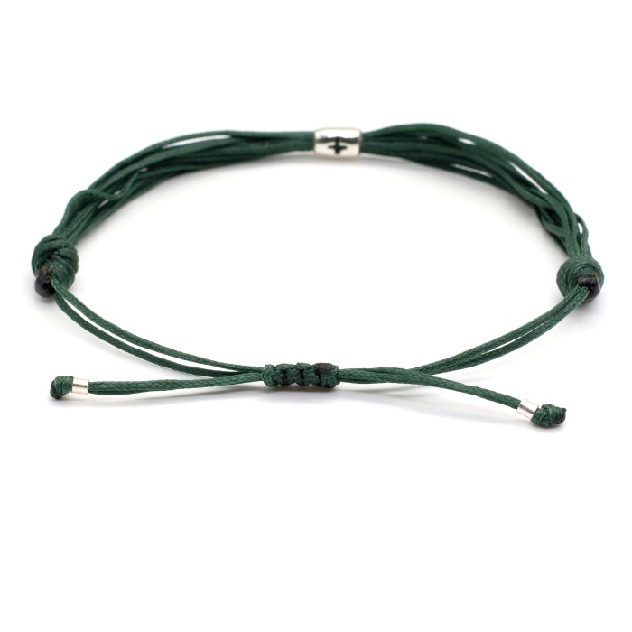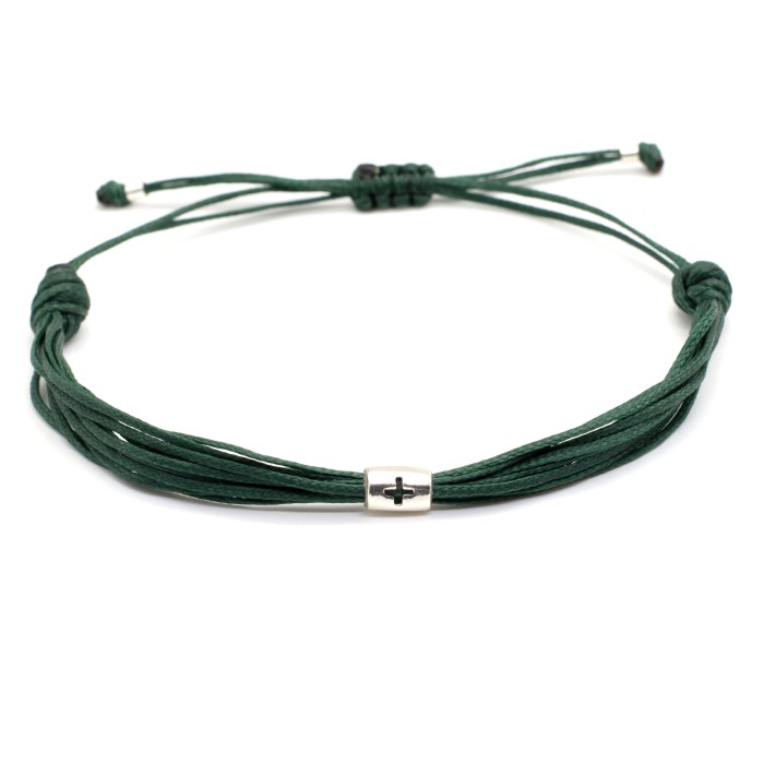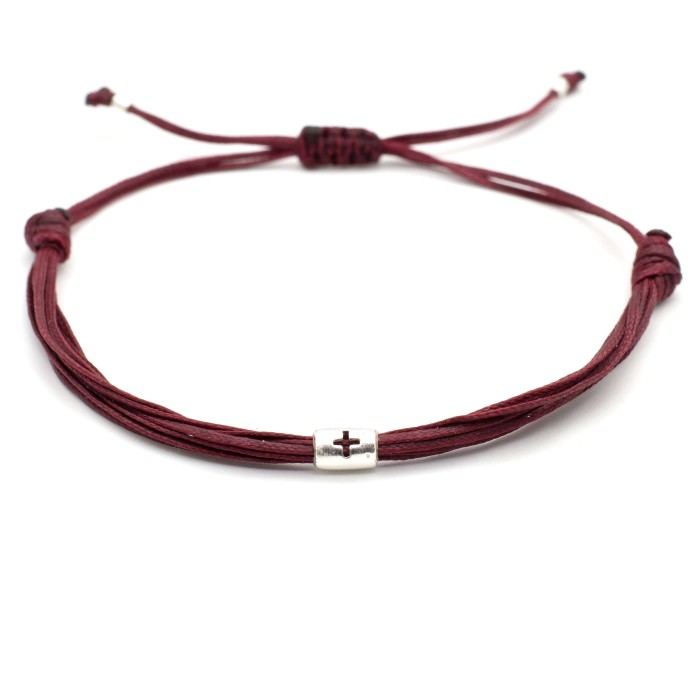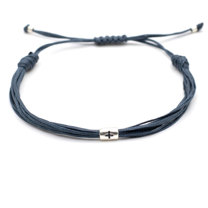 Ένα χειροποίητο βραχιόλι από κηροκλωστή που προσαρμόζεται στο μέγεθος που επιθυμείτε (μακραμέ). Ο σταυρός και το κούμπωμα είναι από ασήμι 925.