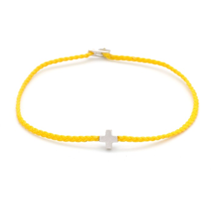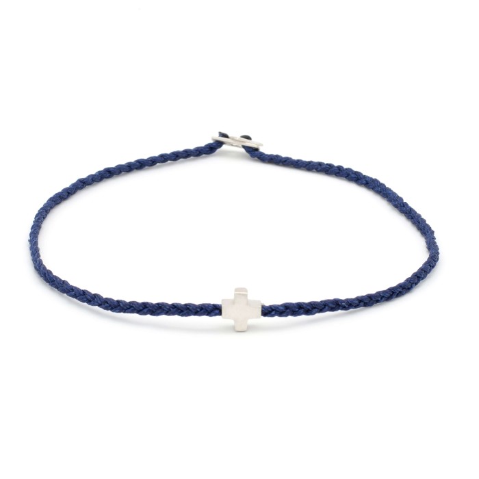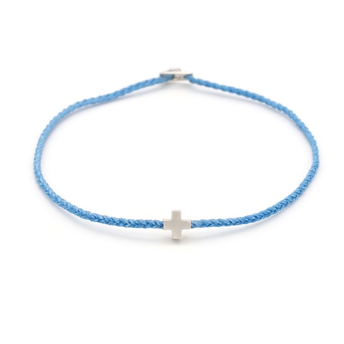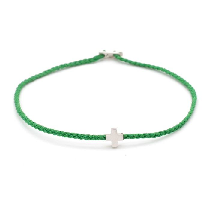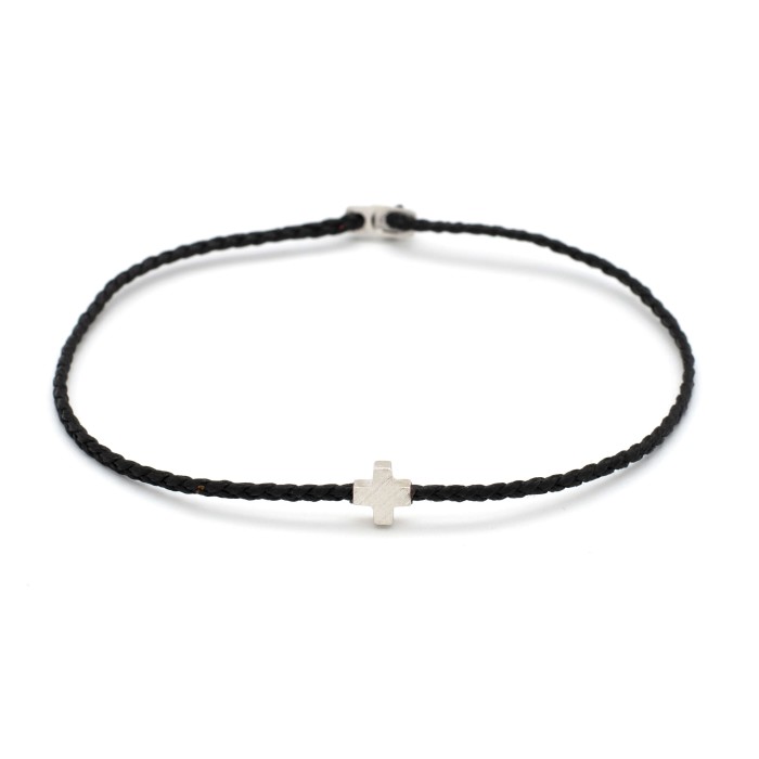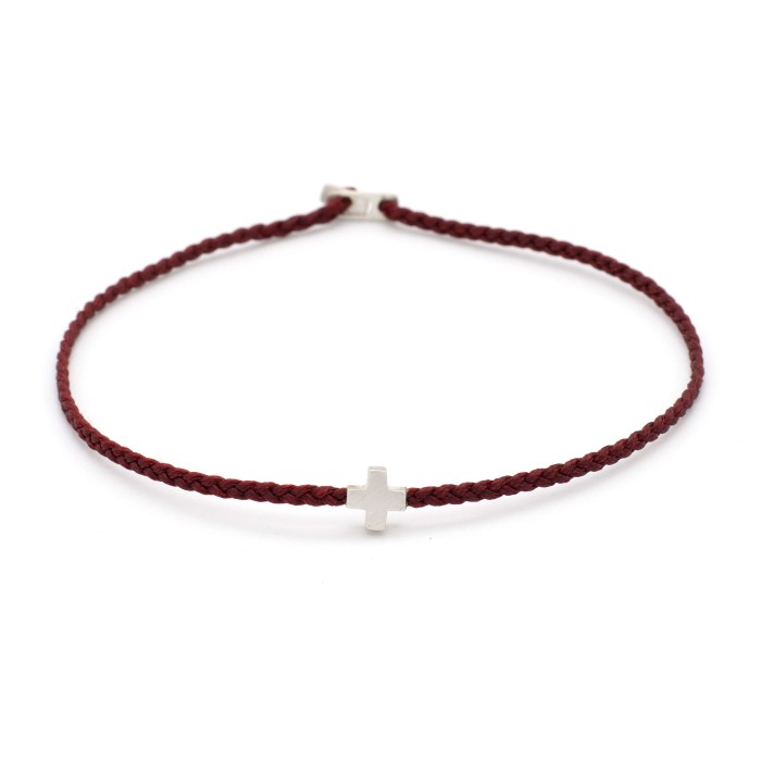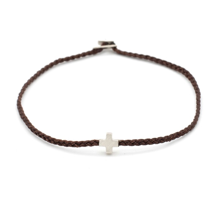 Ένα χειροποίητο πλεκτό βραχιόλι από κηροκλωστή που προσαρμόζεται στο μέγεθος που επιθυμείτε. Ο σταυρός και το κούμπωμα είναι από ασήμι 925.