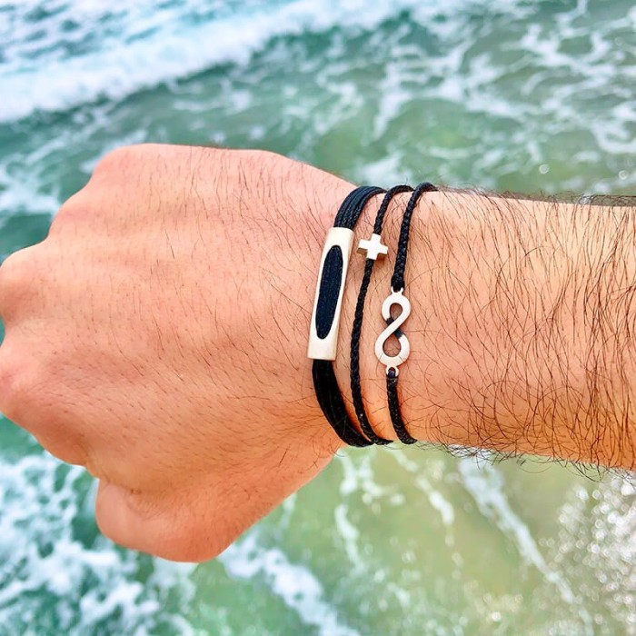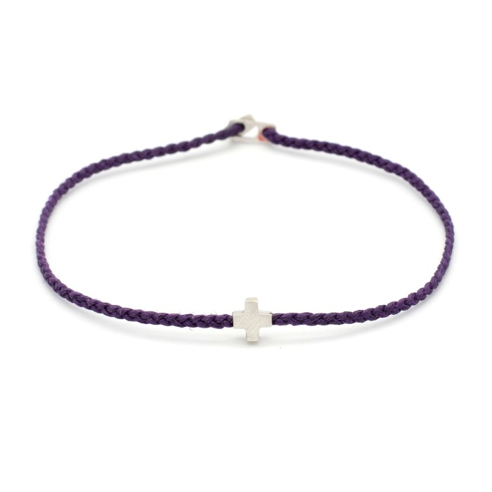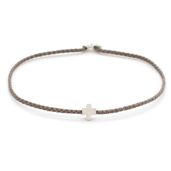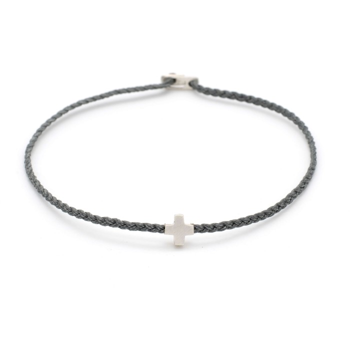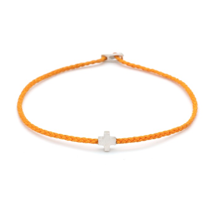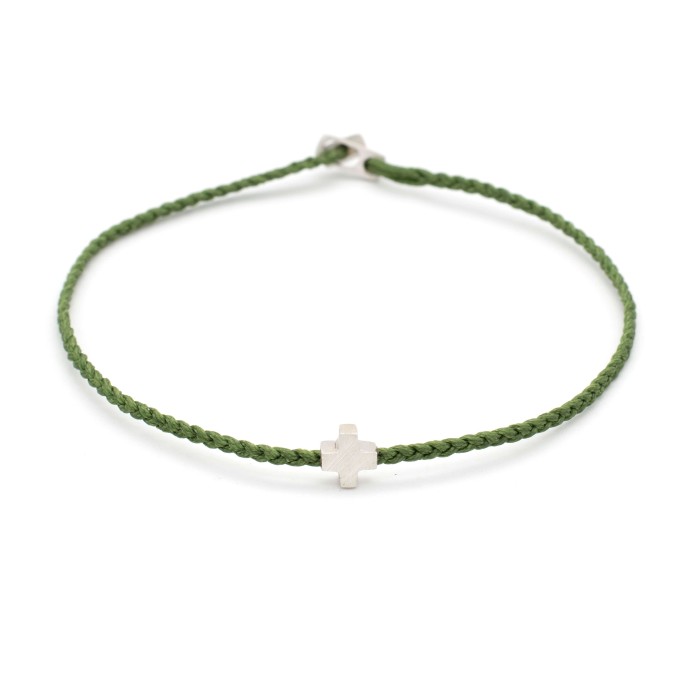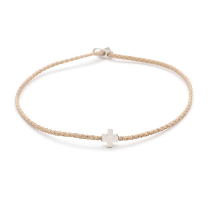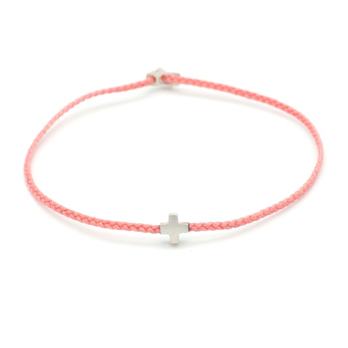 Ένα χειροποίητο πλεκτό βραχιόλι από κηροκλωστή που προσαρμόζεται στο μέγεθος που επιθυμείτε. Ο σταυρός και το κούμπωμα είναι από ασήμι 925.