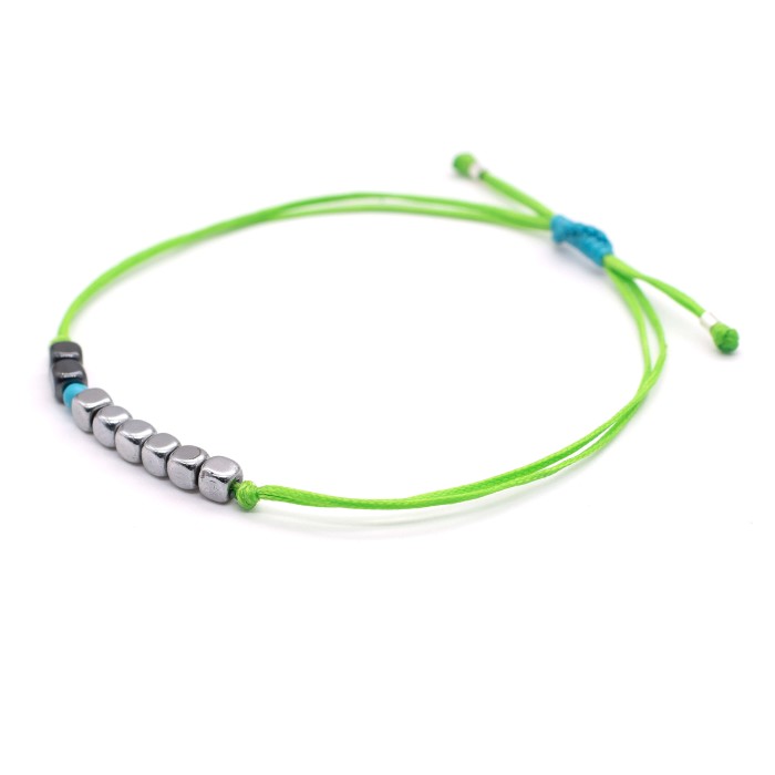The "Lucky Charm 26 Mix" bracelet blends minimal design with natural beauty. Featuring hematite beads and a turquoise howlite bead that together form the number “26”, it symbolizes harmony, renewal, and balance.