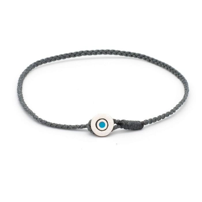 A handmade anklet made out of braided cord, which adapts to the size of your leg. The Evil Eye, which is also the anklet's clasp, is made out of sterling silver.