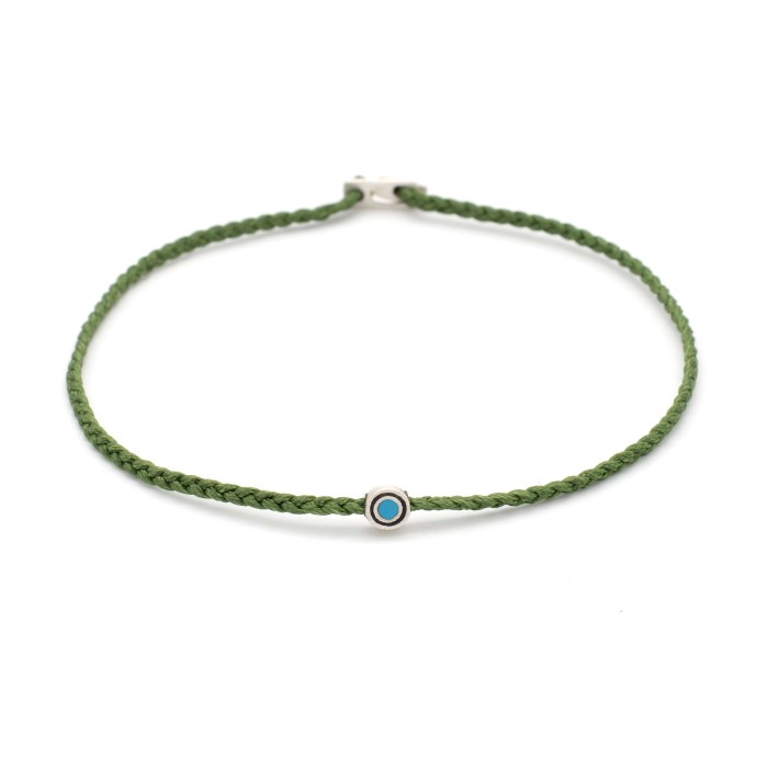 A handmade anklet made of braided cord, which adapts to the size of the leg. The evil eye and the clasp are made out of sterling silver.