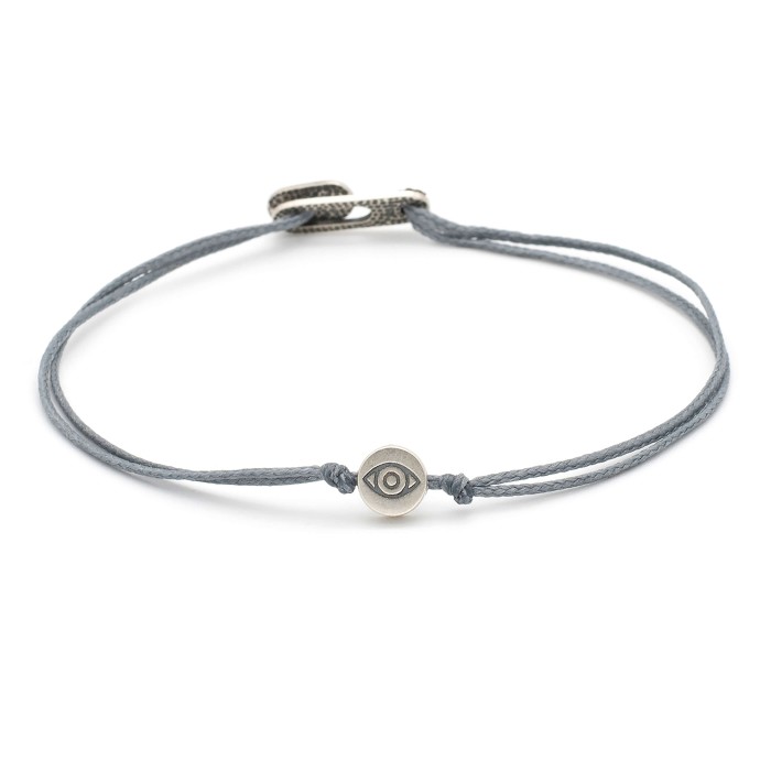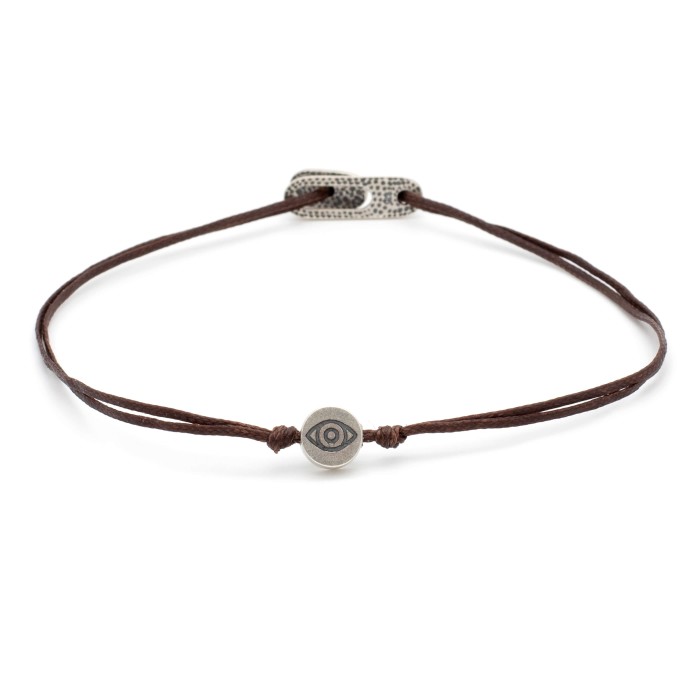 A handmade cord bracelet which adapts to the size of your hand. The evil eye and the bracelet's clasp are made out of sterling silver.