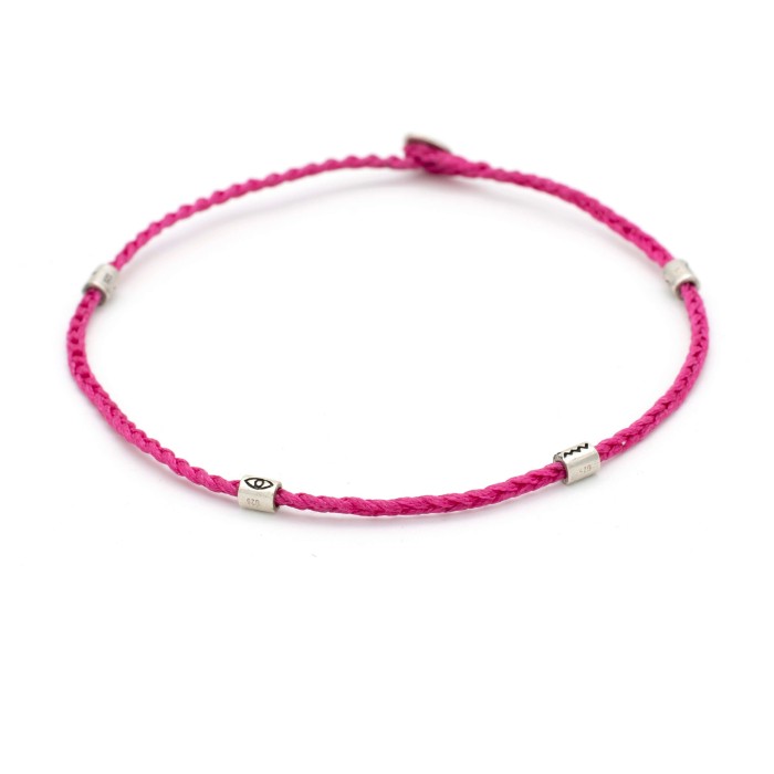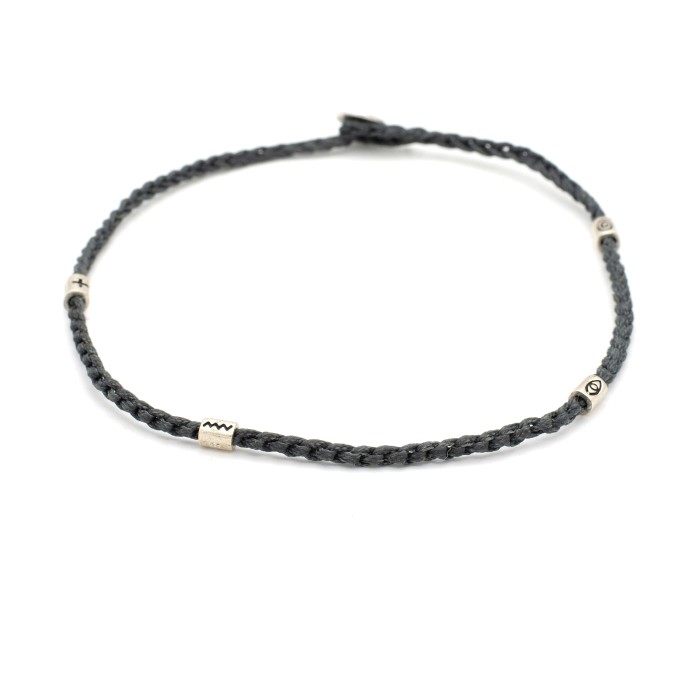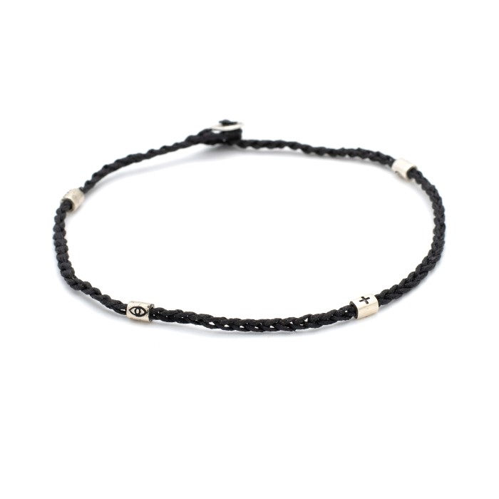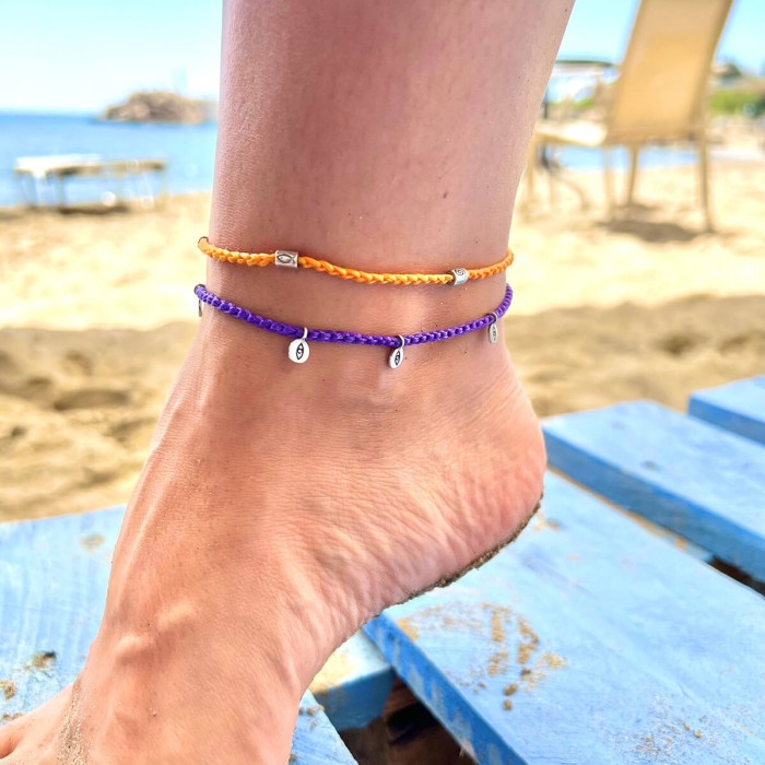 A handmade anklet uniquely designed and made out of a high quality braided cord. The four elements of the anklet and ther clasp are made out of silver 925and they are "by luck" chosen and positioned on the ancklet, making your day challenging! The bracelet's size is adjustable.